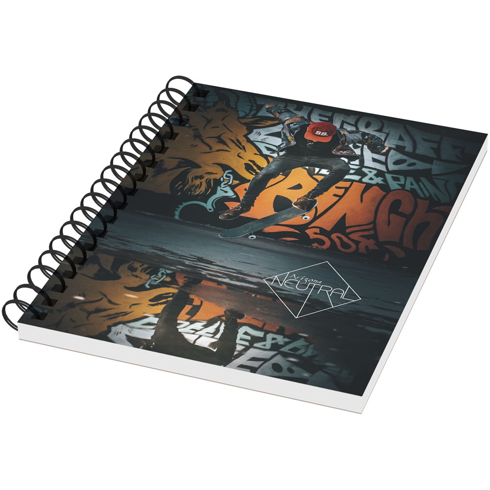 Desk-Mate® A6 spiraal notitieboek. Bevat 50 bladen (80g/m2) blanco papier en een (450g/m2) omslag. De omslag is scheur- en waterdicht. Witte kleur spiraal. Decoratie is mogelijk op de omslag en op elk blad.