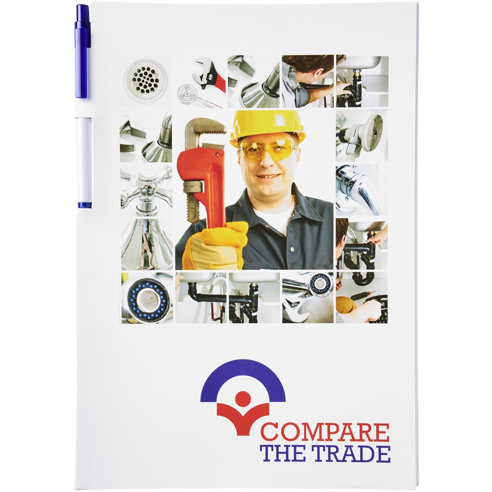 Essential conference set in A4-formaat. Bevat een A4 kladblok met 50 bladen (80g/m2) blanco papier en een ballpointpen in de rug. De conference set heeft een harde omslag (350g/m2). Volledig gekleurde decoratie mogelijk aan beide zijden van de omslag en op elk blad.