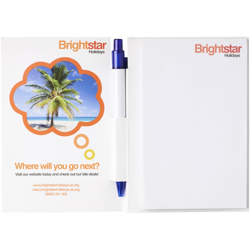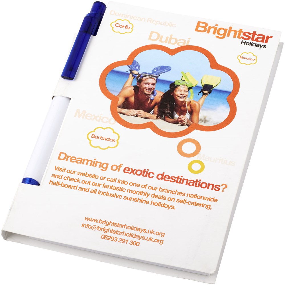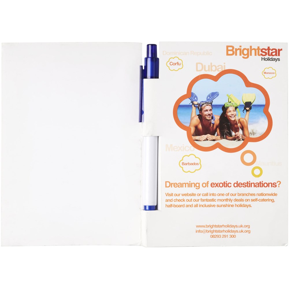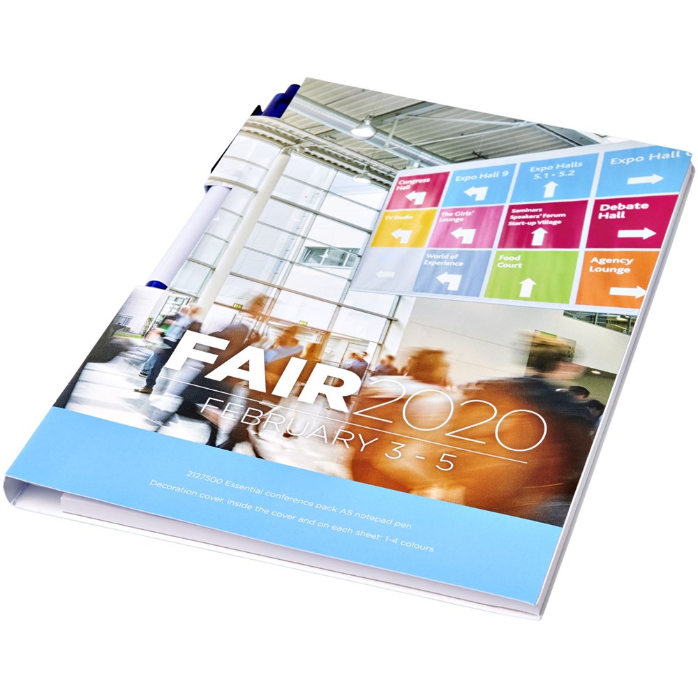 Essential conference set in A5-formaat. Bevat een A5 kladblok met 50 bladen (80g/m2) blanco papier en een ballpointpen in de rug. De conference set heeft een harde omslag (350g/m2). Volledig gekleurde decoratie mogelijk aan beide zijden van de omslag en op elk blad.