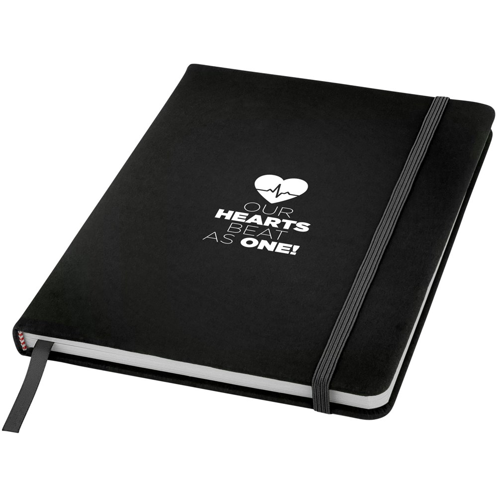 A5 formaat notitieboek met bijpassende gekleurde elastieksluiting en paginalint. 96 pagina's van 60g/m2 gelinieerd papier. Pagina's niet helder wit.