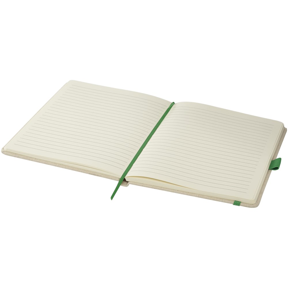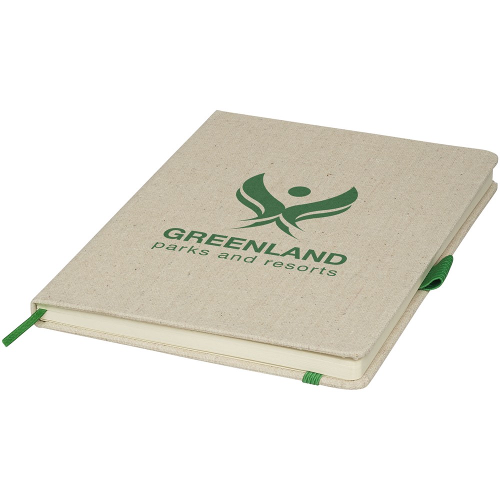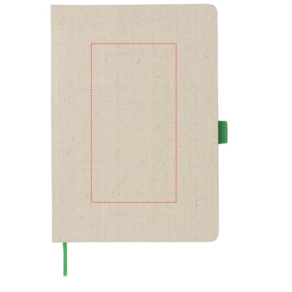A5 formaat canvas notitieboekje met gekleurde elastieksluiting en paginalint. Een elastische penlus en 80 pagina's van 70 gram met gelinieerd papier.