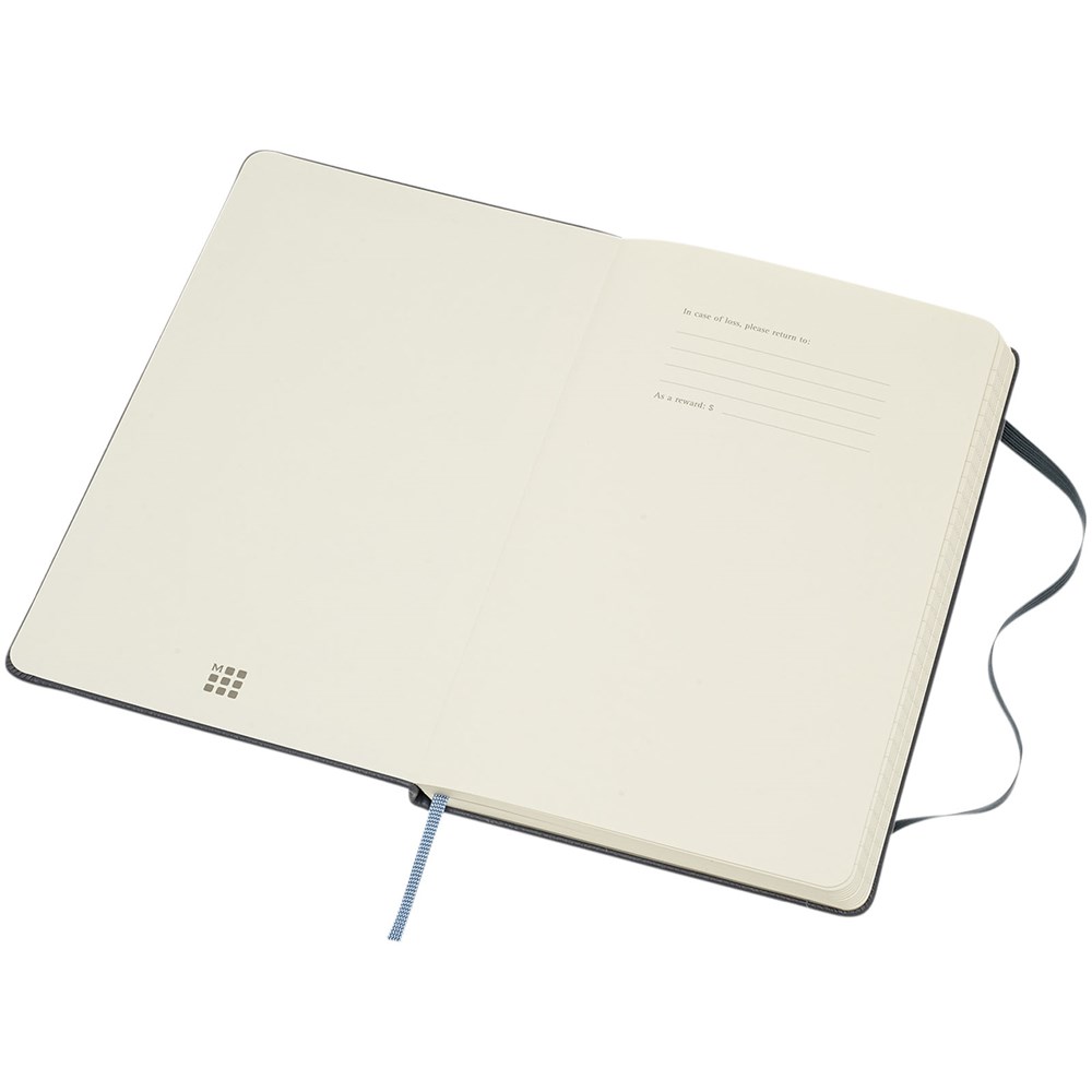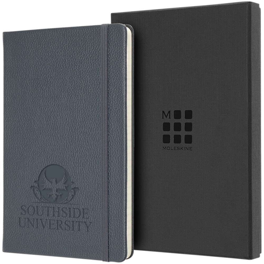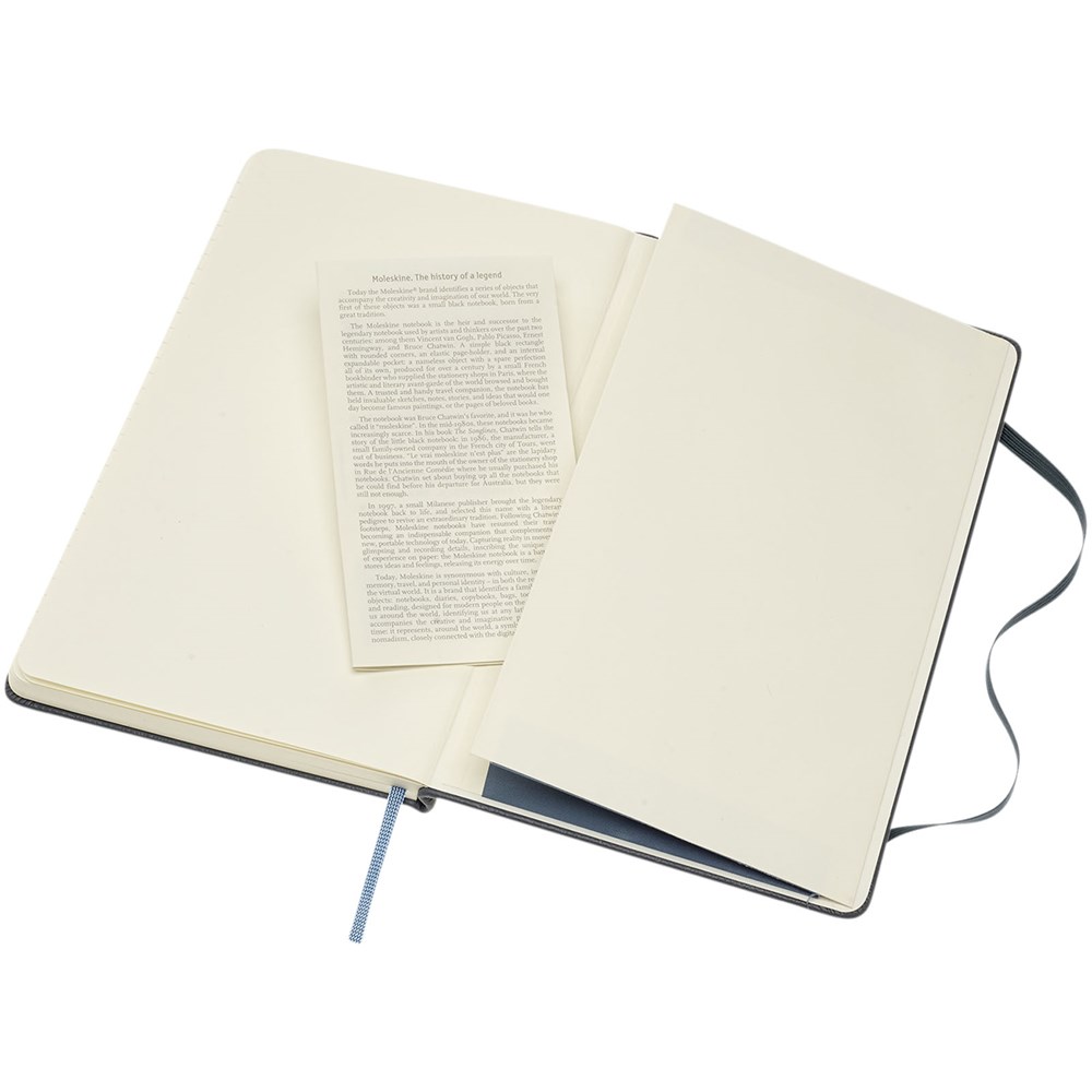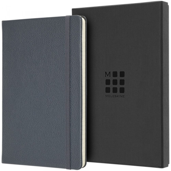 Premium leren notitieboek verkrijgbaar in 4 kleuren en aangeboden in een zwarte Moleskine geschenkverpakking. Met afgeronde hoeken, elastische sluiting en een bladwijzer. Met uitschuifbaar vakje aan de achterkant en bevat 176 pagina's gelinieerd papier in 100 g/m² ivoorkleurig papier. 'In geval van verlies' staat op het schutblad afgedrukt.