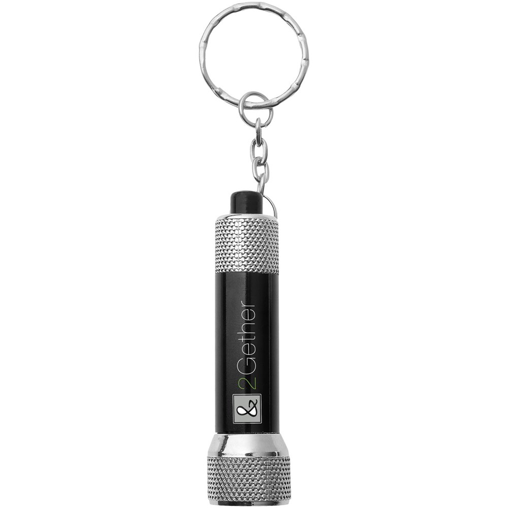 Sleutelhangerlampje met 5 helder witte LED's en aan-/uitknop. Metalen sleutelring. Inclusief batterijen.