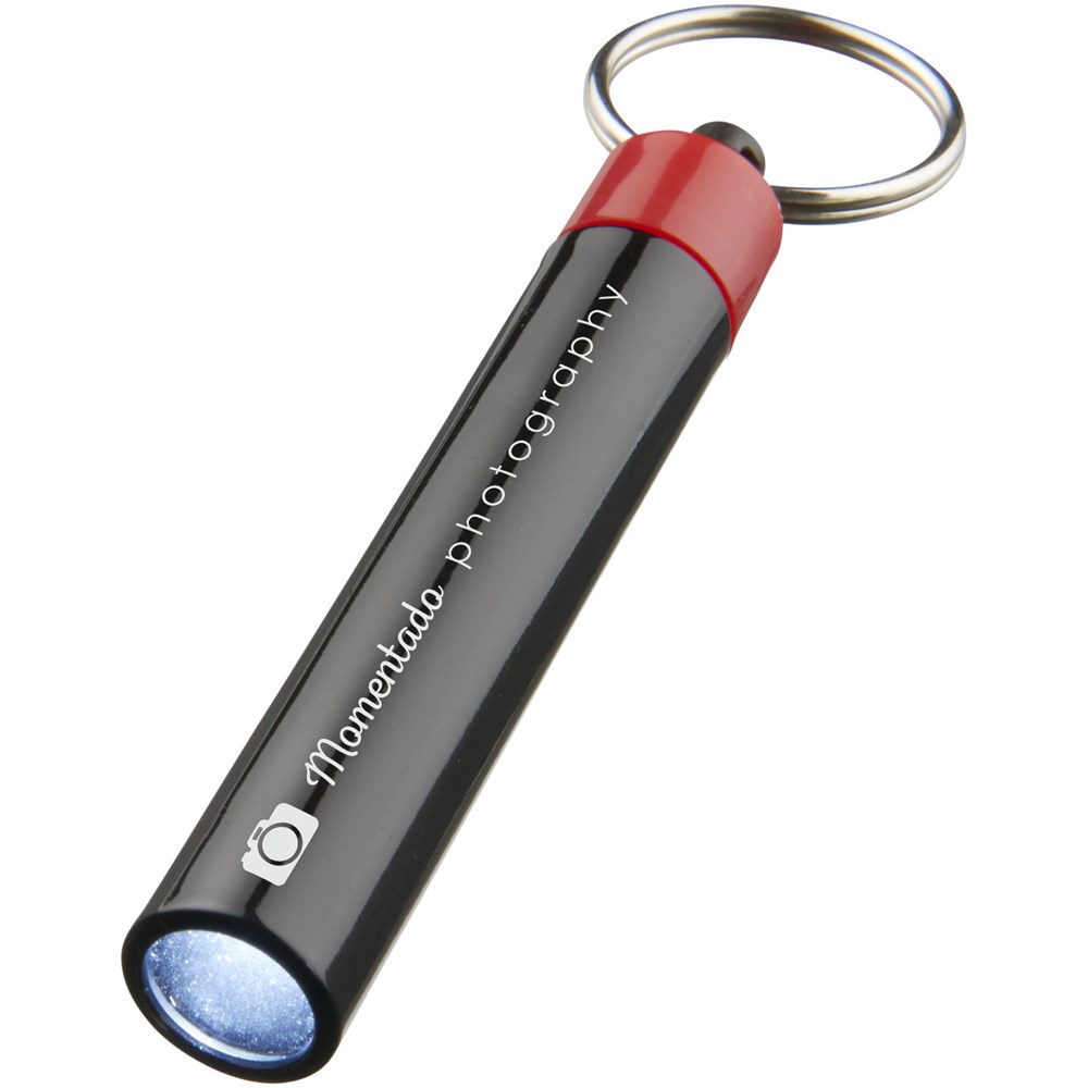 Retro premium LED sleutelhangerlampje. Sleutelhanger UV-gecoat met enkel wit LED-lampje dat wordt geregeld door een drukknopschakelaar. Metalen split sleutelring. Inclusief batterijen. ABS kunststof.