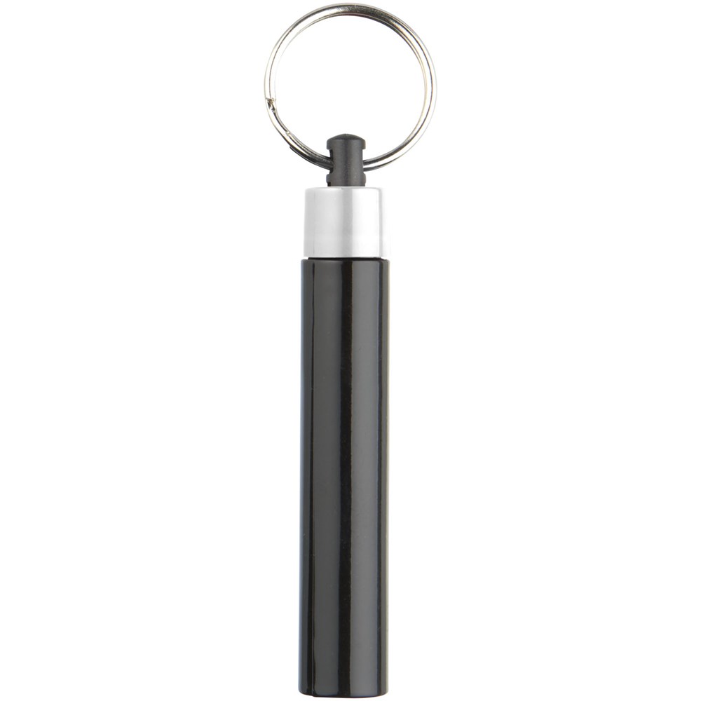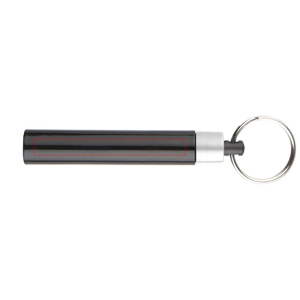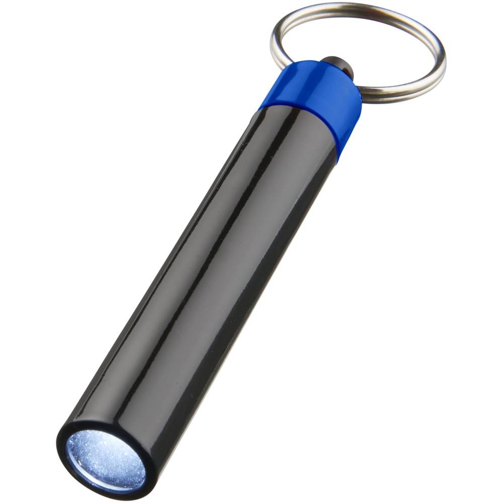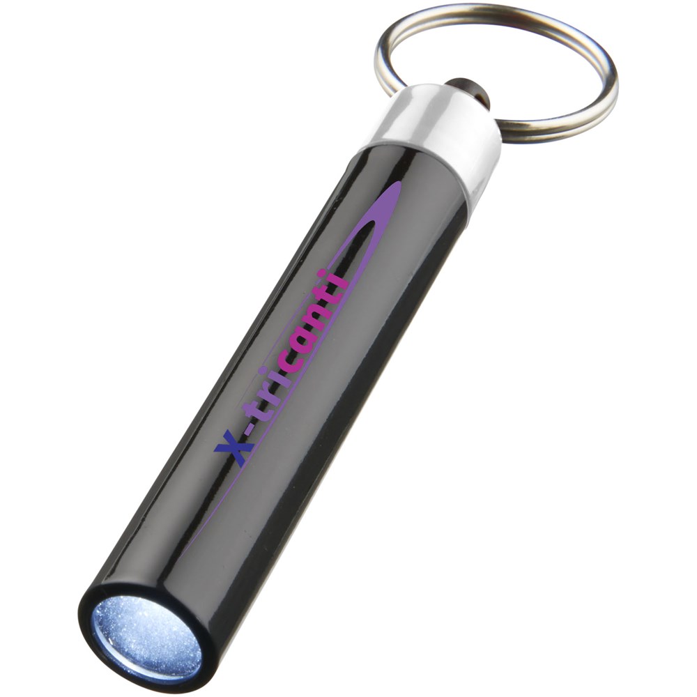 Retro premium LED sleutelhangerlampje. Sleutelhanger UV-gecoat met enkel wit LED-lampje dat wordt geregeld door een drukknopschakelaar. Metalen split sleutelring. Inclusief batterijen. ABS kunststof.