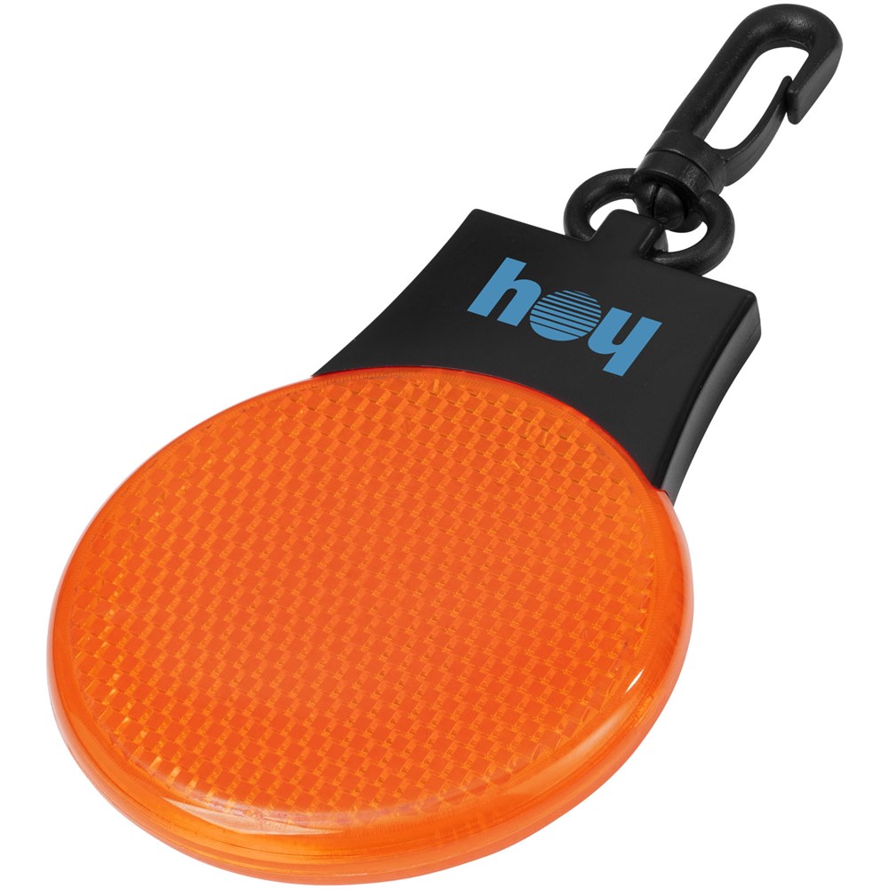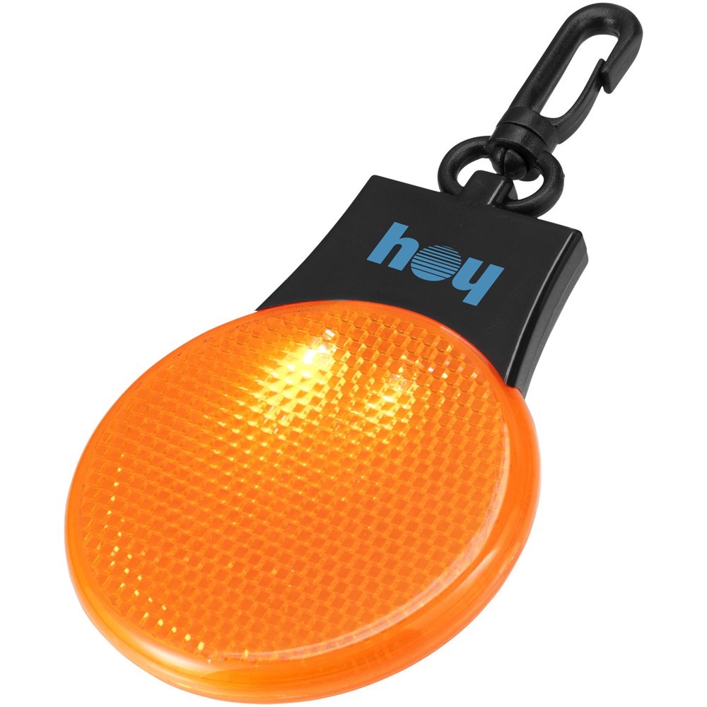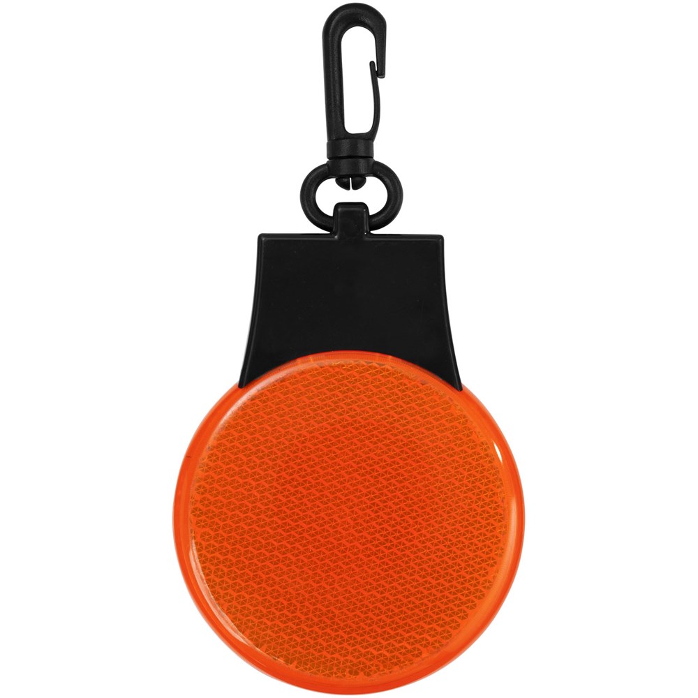 Reflectorlamp met drie LED lichtstanden – constant, knipperend en flitsend van links naar rechts. Met aan-/uitknop en functieschakelaar op de achterkant. Kunststof clip. Inclusief batterijen.