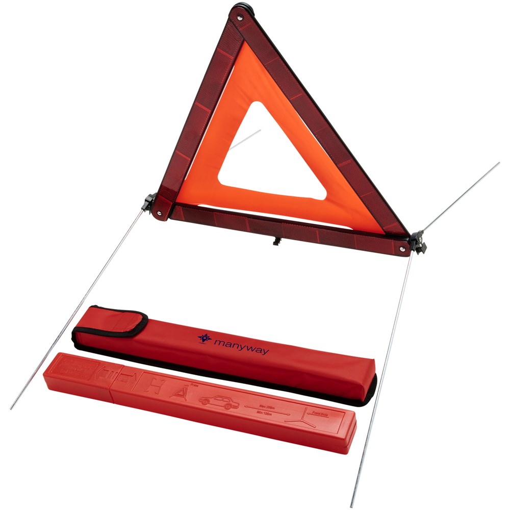 De waarschuwingsdriehoek is in overeenstemming met de Europese norm EC R27. Hij wordt geleverd in een plastic doos en een polyester zakje met klittenband aan de achterkant, zodat hij op zijn plaats blijft tijdens het rijden. Plaats hem altijd op 5° links van het verticale vlak. Het wordt aanbevolen om de waarschuwingsdriehoek 50-100 meter achter het voertuig met problemen op een gewone weg te plaatsen, en 100-200 meter achter het voertuig op een snelweg. Goedkeuringsnr.: 27R-043555.