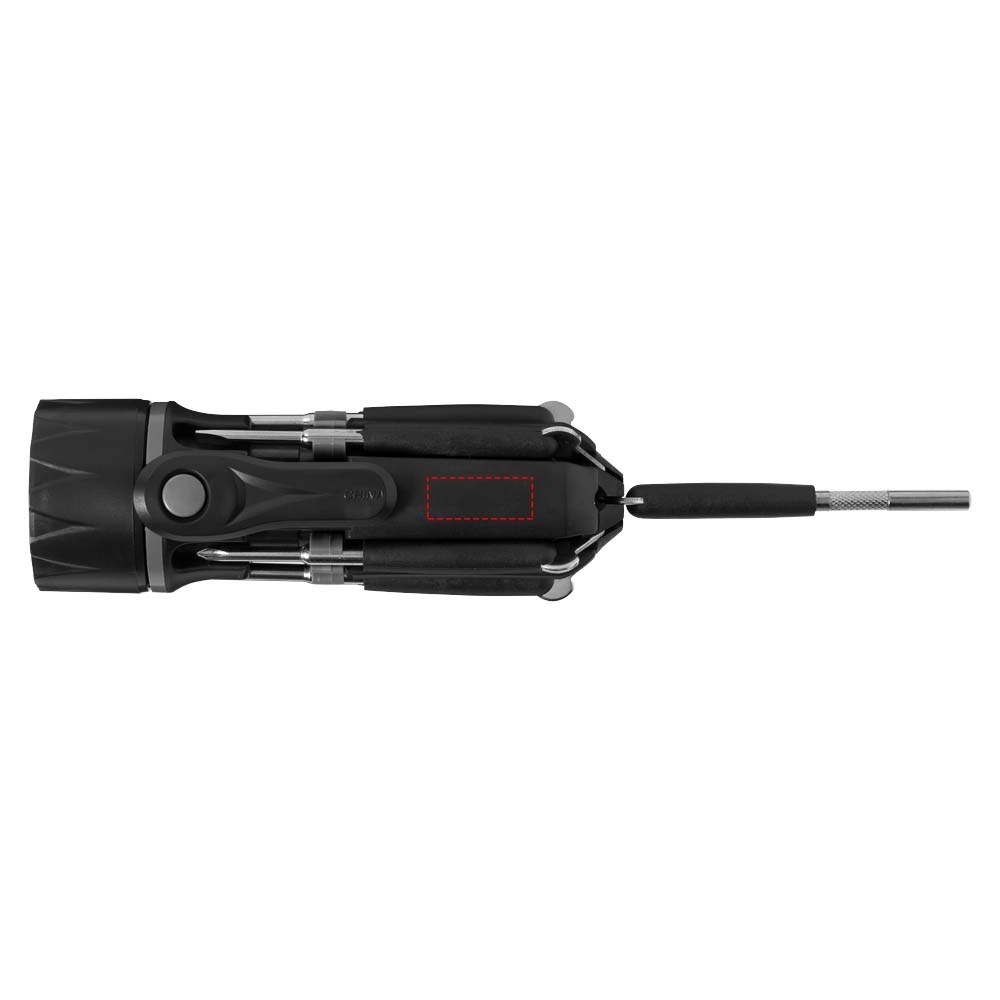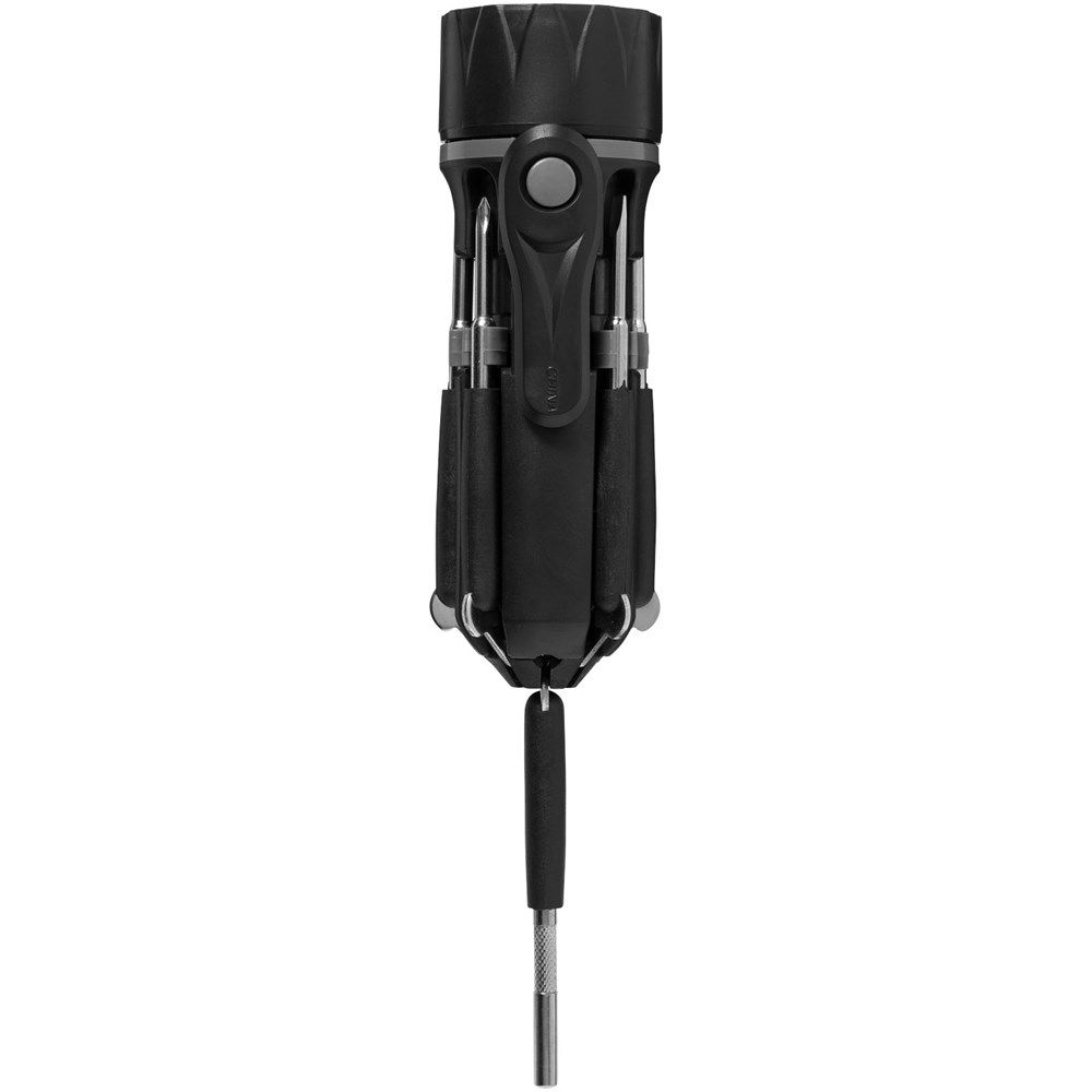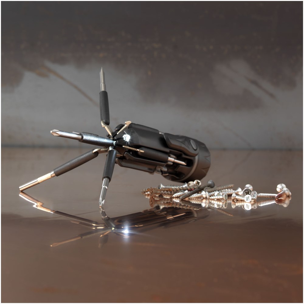 Perfect om in huis te hebben. Het heeft 1 LED lampje, 3 kruiskoppen, 3 platte koppen en een klein gereedschap met schroef op de bovenkant. Druk eenmaal op de knop voor de zaklamp, en opnieuw voor het verlichten van het gereedschap met de LED. Verpakt in een STAC geschenkverpakking. Batterijen inbegrepen. Exclusief ontwerp.