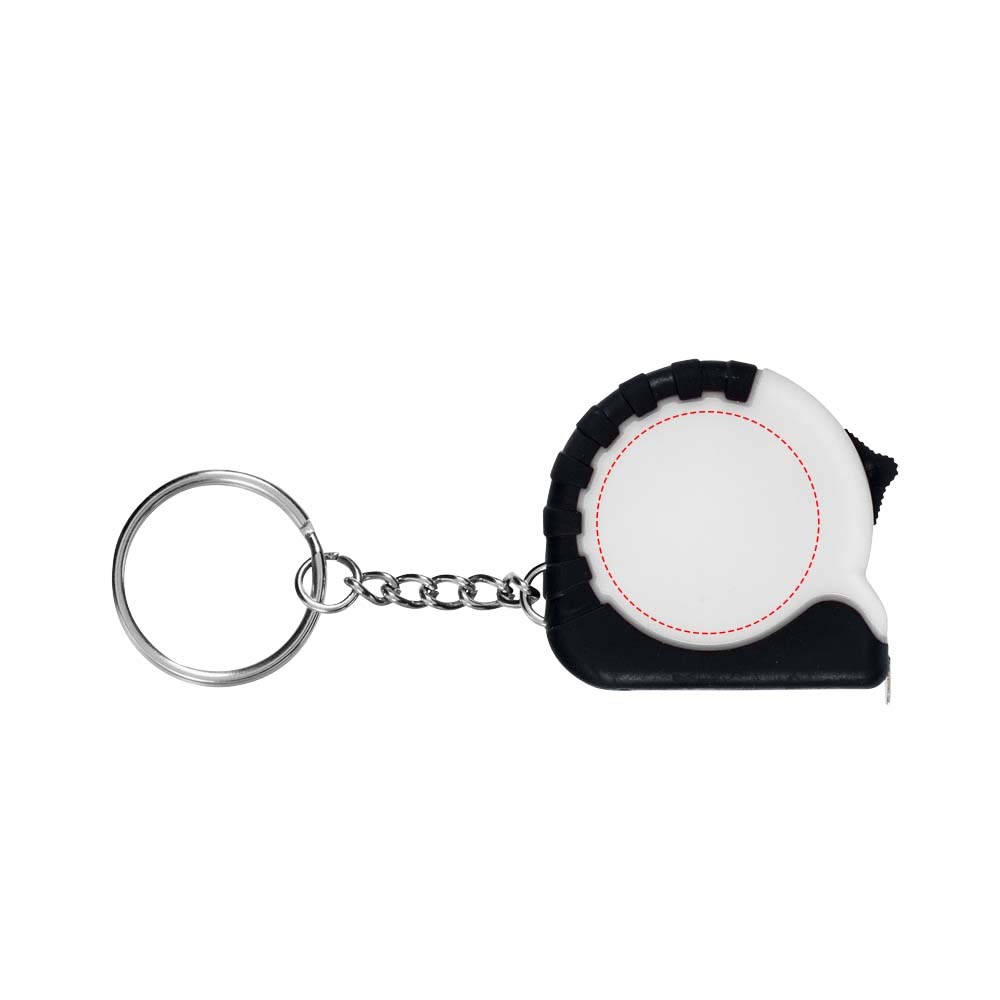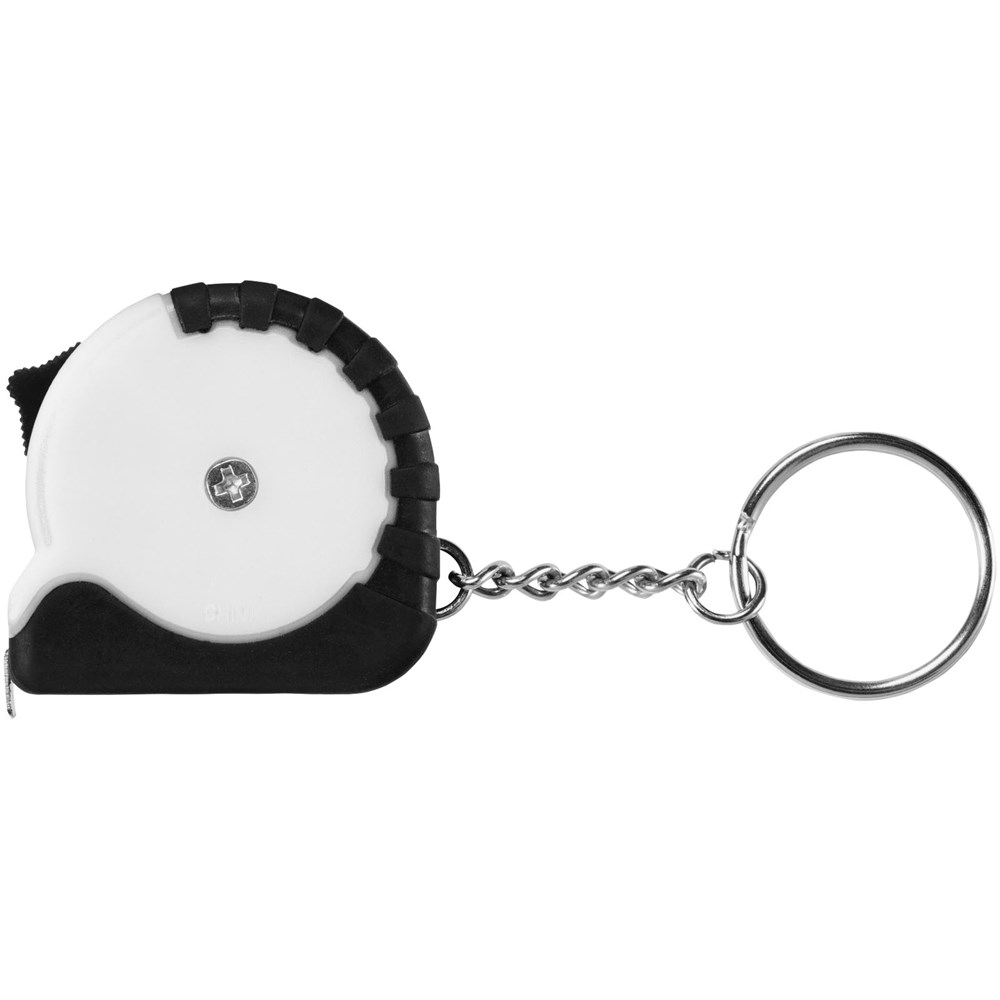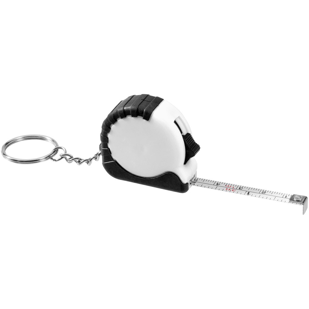 Rolmaat van 1 meter met vergrendeling en verdeling in centimeters en inches. Vergrendelingsknop op de zijkant. Rubberen greep. Metalen sleutelhanger. Niet geschikt voor professioneel gebruik en geijkte toepassingen.