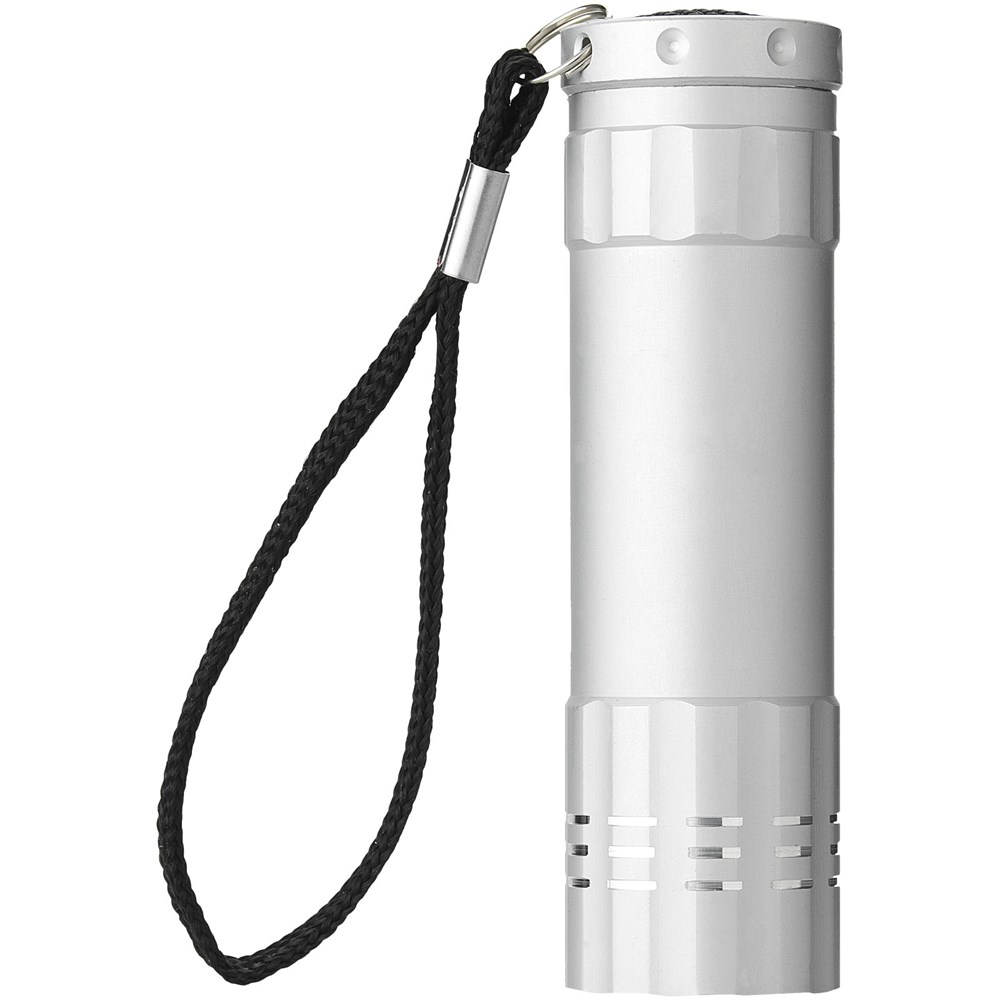 Stijlvolle zaklamp met 9 heldere LEDs. Polsriempje, aan-/uit-drukknop aan de achterkant. Werkt op 3 AAA-batterijen.