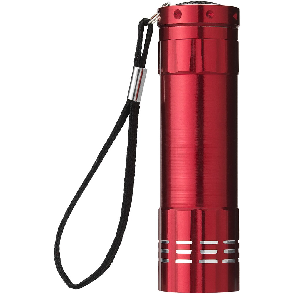 Stijlvolle zaklamp met 9 heldere LEDs. Polsriempje, aan-/uit-drukknop aan de achterkant. Werkt op 3 AAA-batterijen.