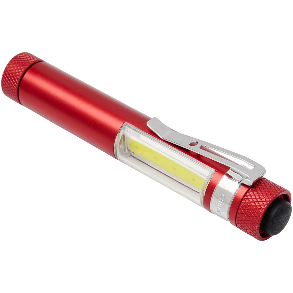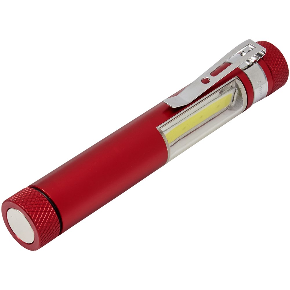 Een handige aluminium COB-zaklamp met magneetvoet en zakclip. Werkt op 5x LR44-batterijen en produceert 42 lumen. Groot logo-decoratiegebied beschikbaar voor zowel tampondruk als lasergravure.