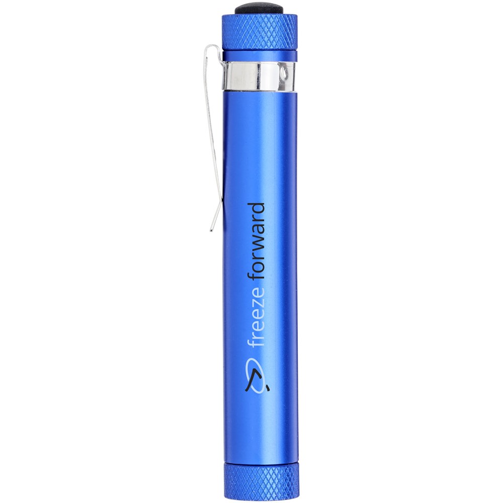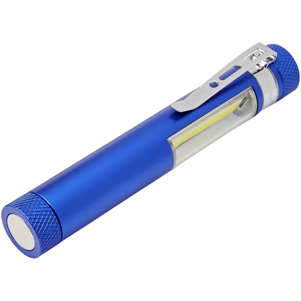 Een handige aluminium COB-zaklamp met magneetvoet en zakclip. Werkt op 5x LR44-batterijen en produceert 42 lumen. Groot logo-decoratiegebied beschikbaar voor zowel tampondruk als lasergravure.