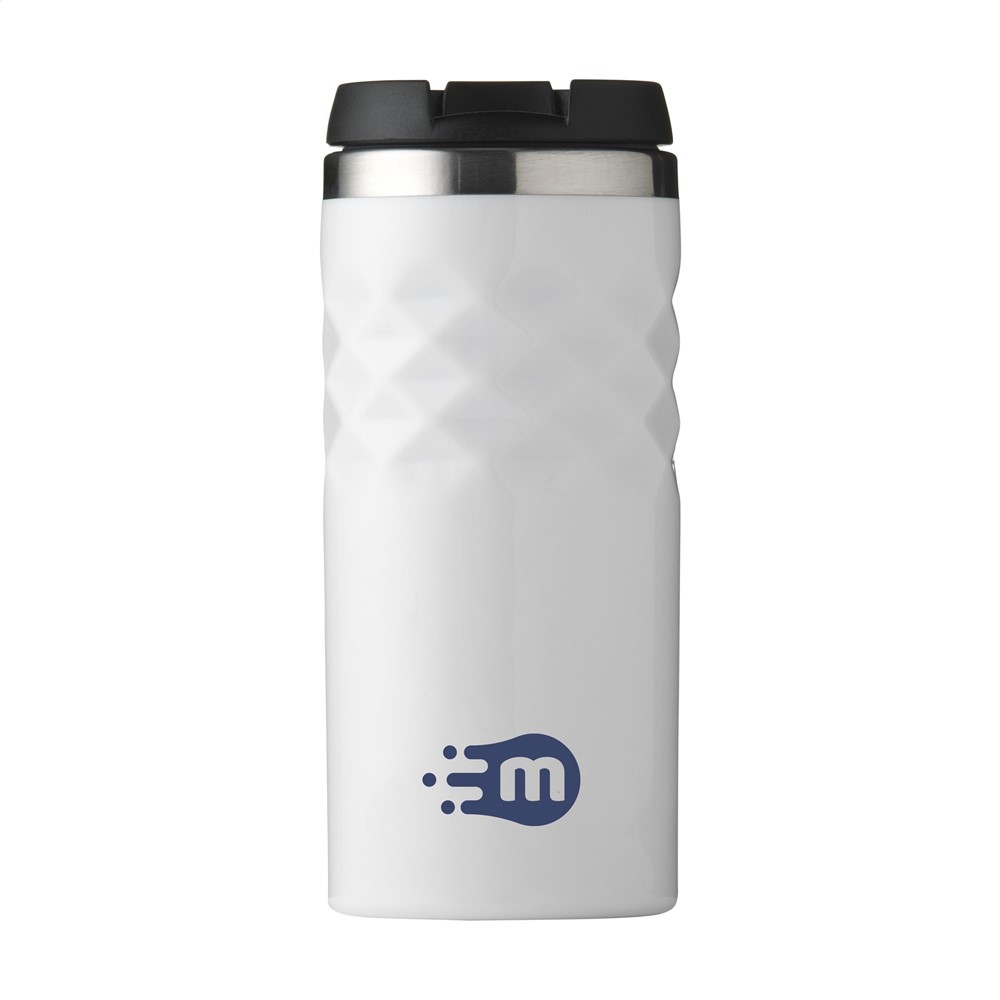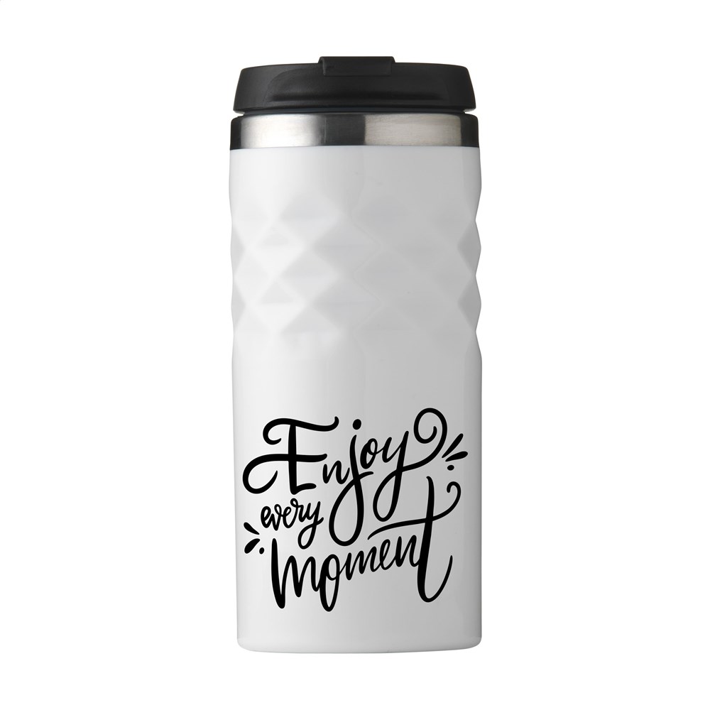 Dubbelwandige, lekvrije kunststof thermosbeker met RVS binnenwand, schroefdeksel en klikopening. Met opvallend 3D-Geometrisch diamantpatroon in de houder. Slipvaste onderzijde. Inhoud 280 ml. Per stuk in doos.