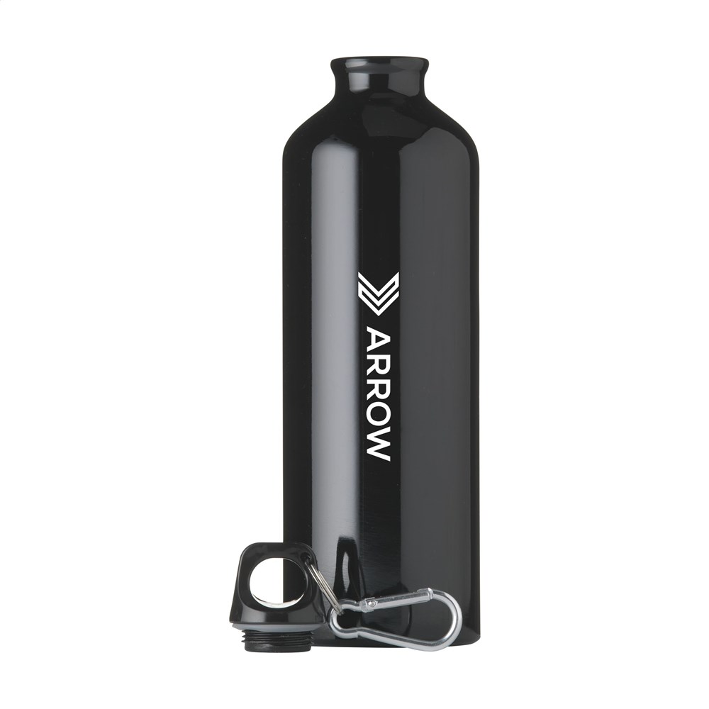 Enkelwandige, aluminium waterfles met hoogglans finish, kunststof schroefdop met sleutelring en metalen karabijnhaak. De karabijnhaak is niet geschikt als klimgereedschap. Lekvrij. Inhoud 750 ml.