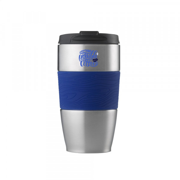Dubbelwandige, lekvrije RVS thermosbeker met schroefdeksel, klikopening -kan eenmaal geopend worden vastgeklikt en dat maakt drinken gemakkelijker-, rubberen grip met opvallend dessin en slipvaste onderzijde. Houdt je drank lang op temperatuur. Inhoud 415 ml. Per stuk in doos.