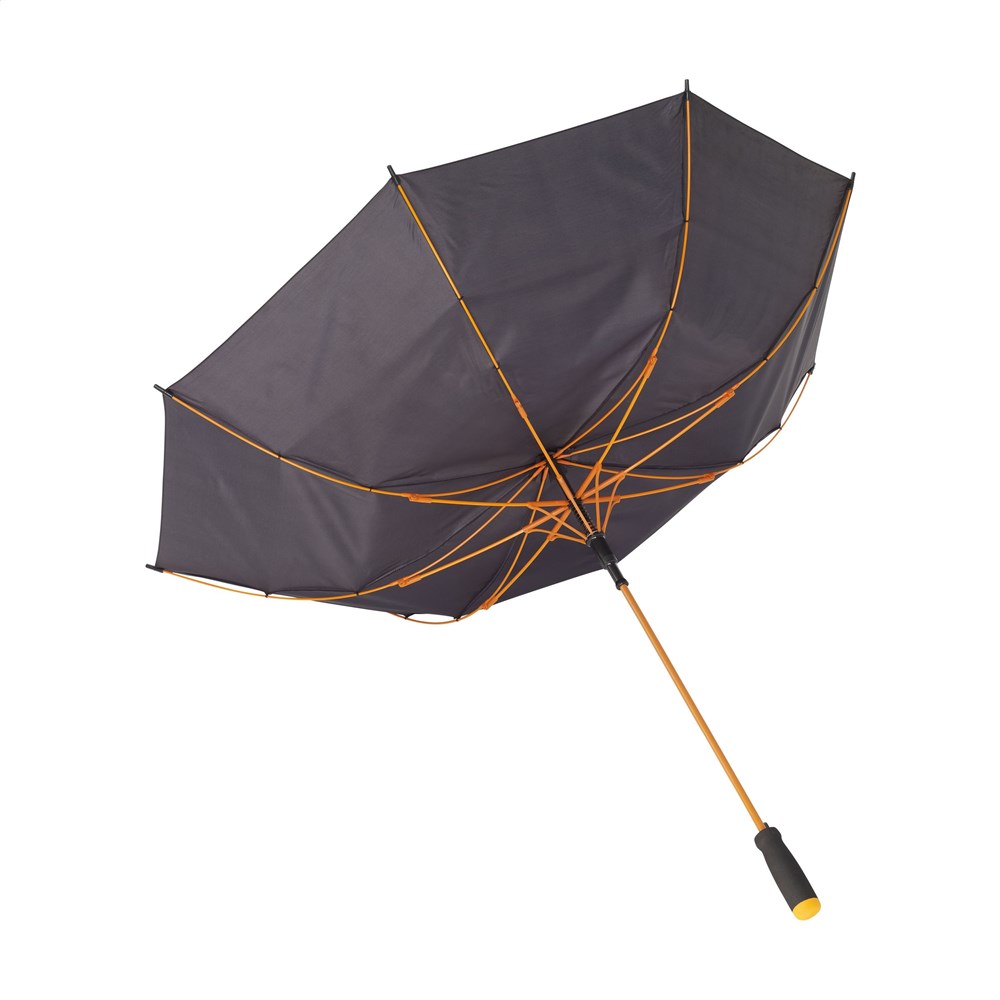 Stormparaplu met automatische telescoopvering, 190T polyester bespanning, metalen steel en kunststof frame, voorgevormde foam handgreep en klittenbandsluiting. In handige opberghoes met schouderriem.