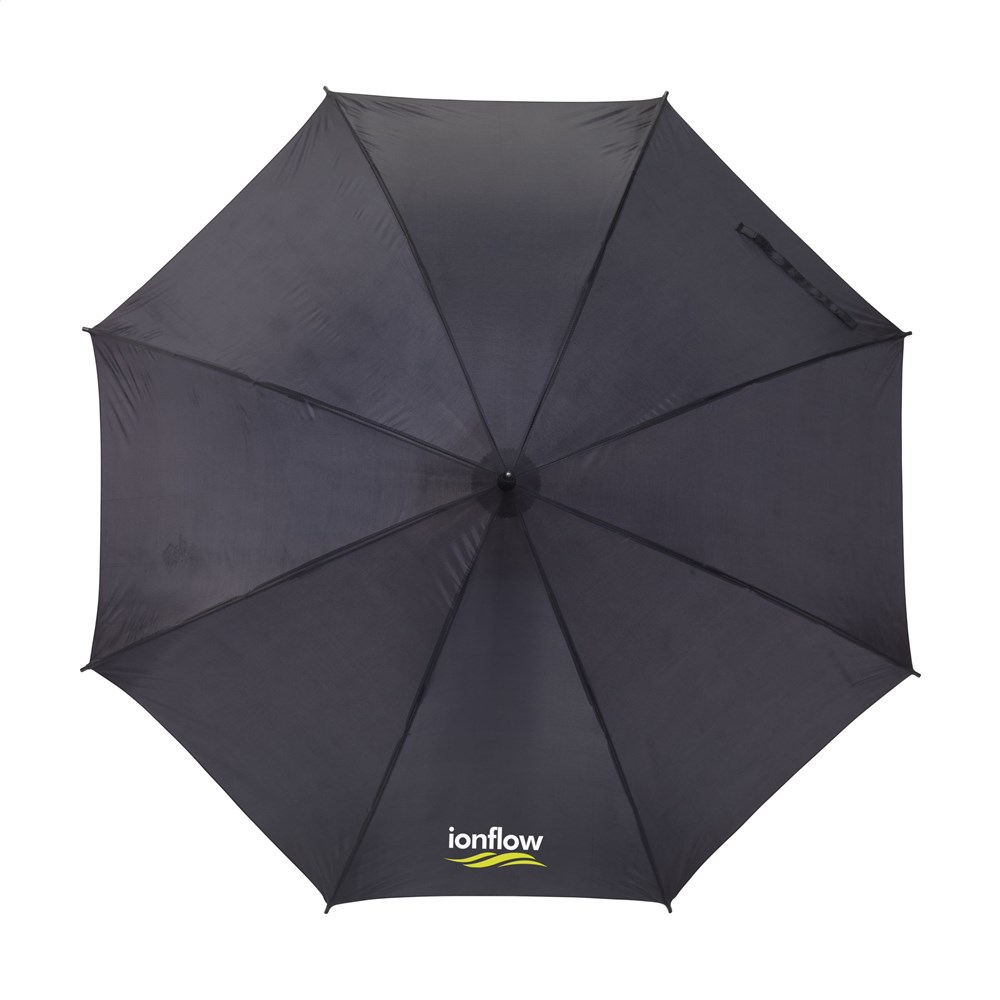 Stormparaplu met automatische telescoopvering, 190T polyester bespanning, metalen steel en kunststof frame, voorgevormde foam handgreep en klittenbandsluiting. In handige opberghoes met schouderriem.