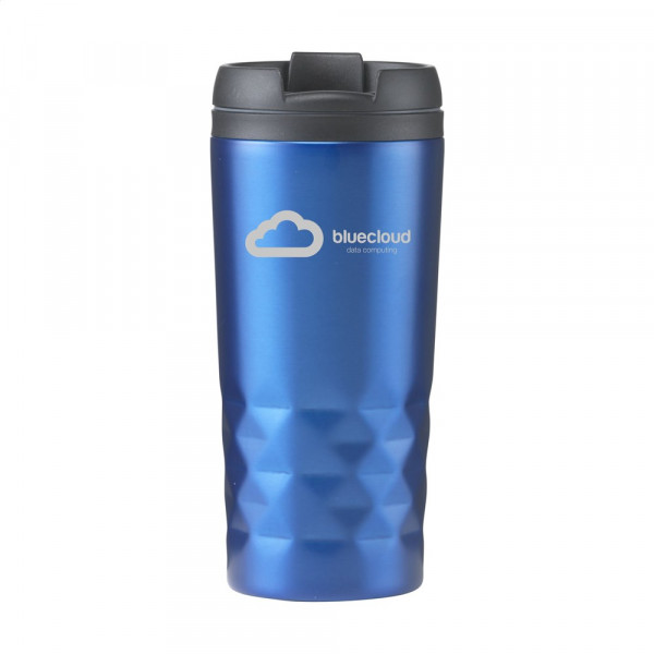 Dubbelwandige, lekvrije, RVS thermosbeker met schroefdeksel en klikopening -kan eenmaal geopend worden vastgeklikt-. Met opvallend 3D-geometrisch diamantpatroon in de houder. Slipvaste onderzijde. Inhoud 300 ml. Per stuk in doos.