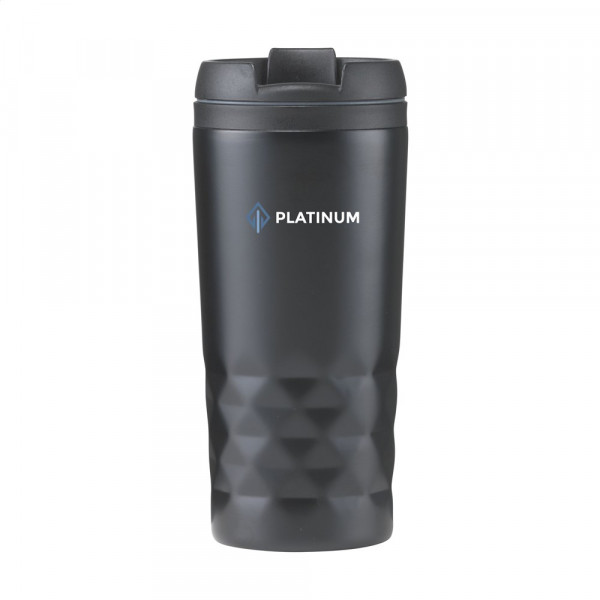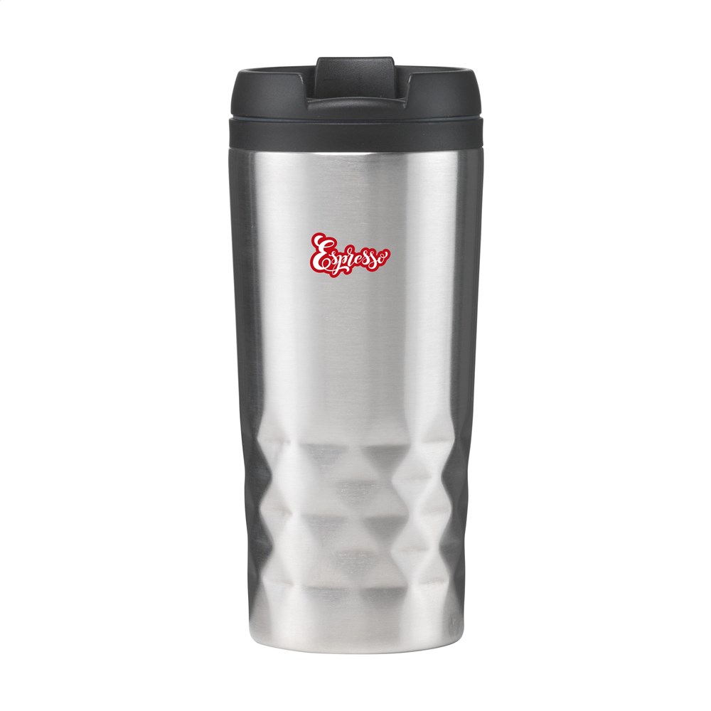 Dubbelwandige, lekvrije, RVS thermosbeker met schroefdeksel en klikopening -kan eenmaal geopend worden vastgeklikt-. Met opvallend 3D-geometrisch diamantpatroon in de houder. Slipvaste onderzijde. Inhoud 300 ml. Per stuk in doos.