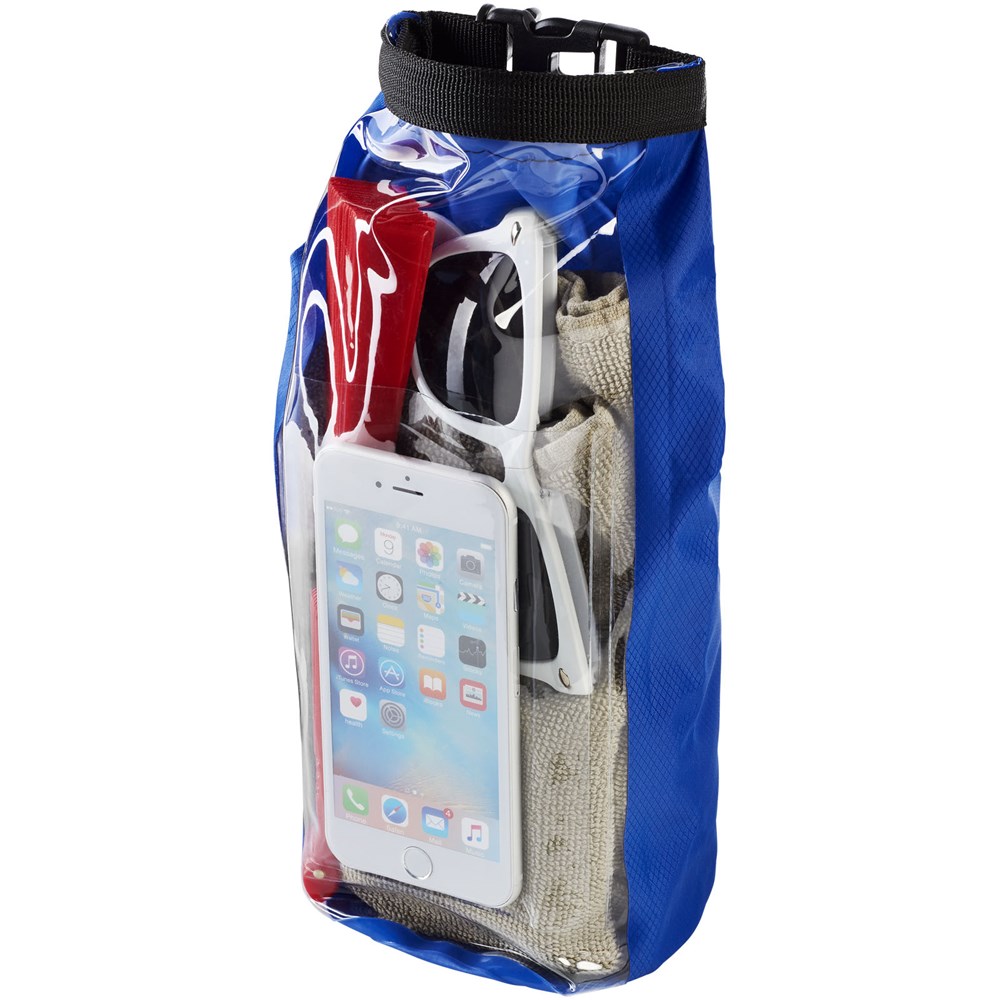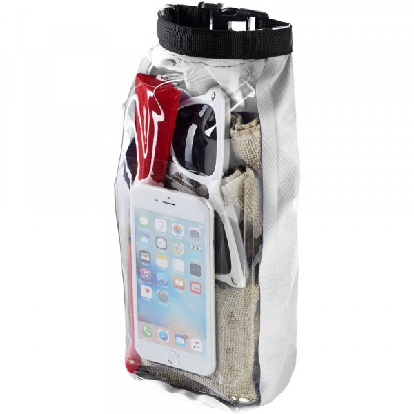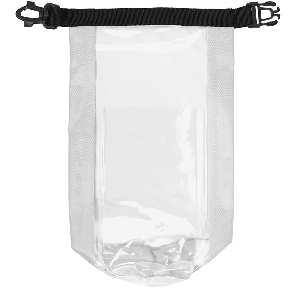 Een waterdichte tas die geweldig is voor buiten. De rolsluiting met plastic gesp zorgt ervoor dat waardevolle spullen droog en veilig worden bewaard. Kan gemakkelijk aan een tas of riem worden bevestigd. Inhoudcapaciteit 2 liter.