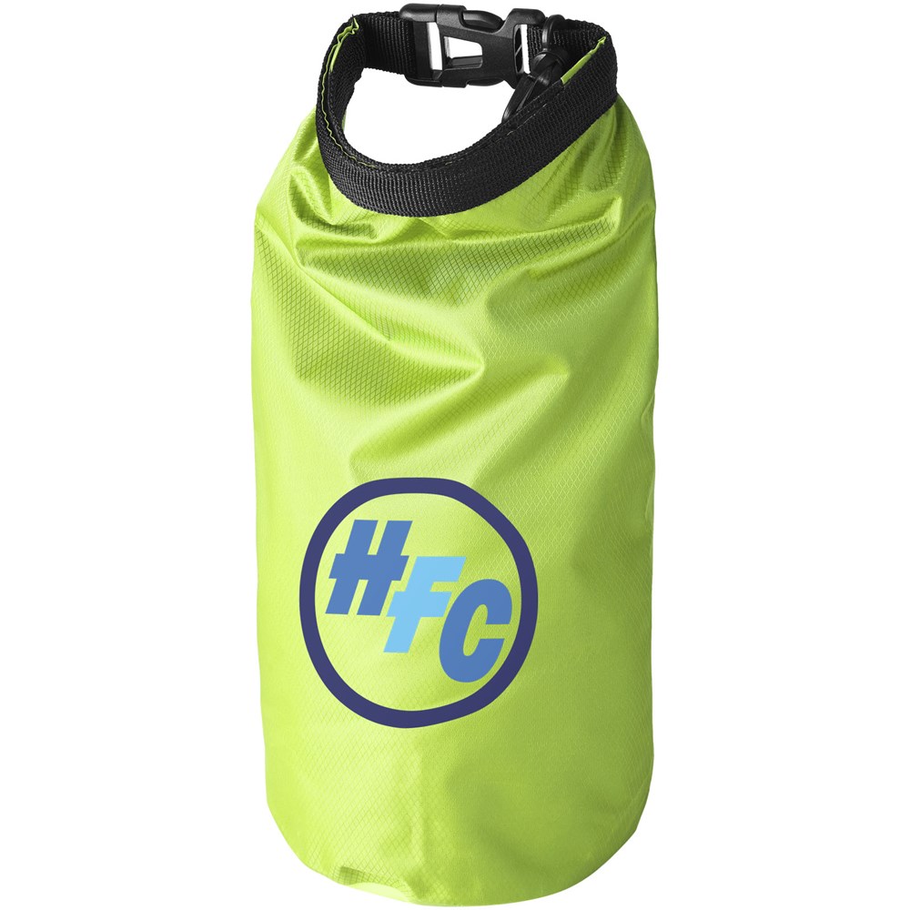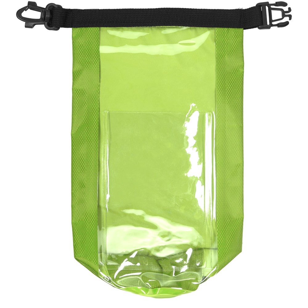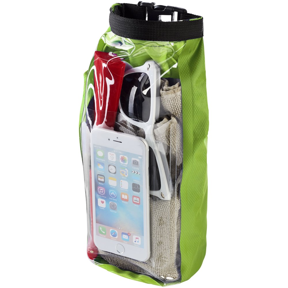 Een waterdichte tas die geweldig is voor buiten. De rolsluiting met plastic gesp zorgt ervoor dat waardevolle spullen droog en veilig worden bewaard. Kan gemakkelijk aan een tas of riem worden bevestigd. Inhoudcapaciteit 2 liter.