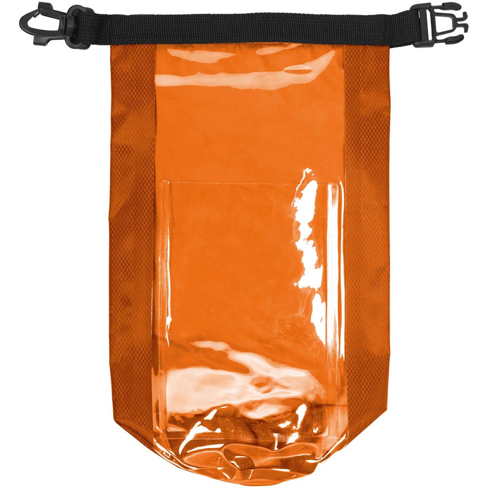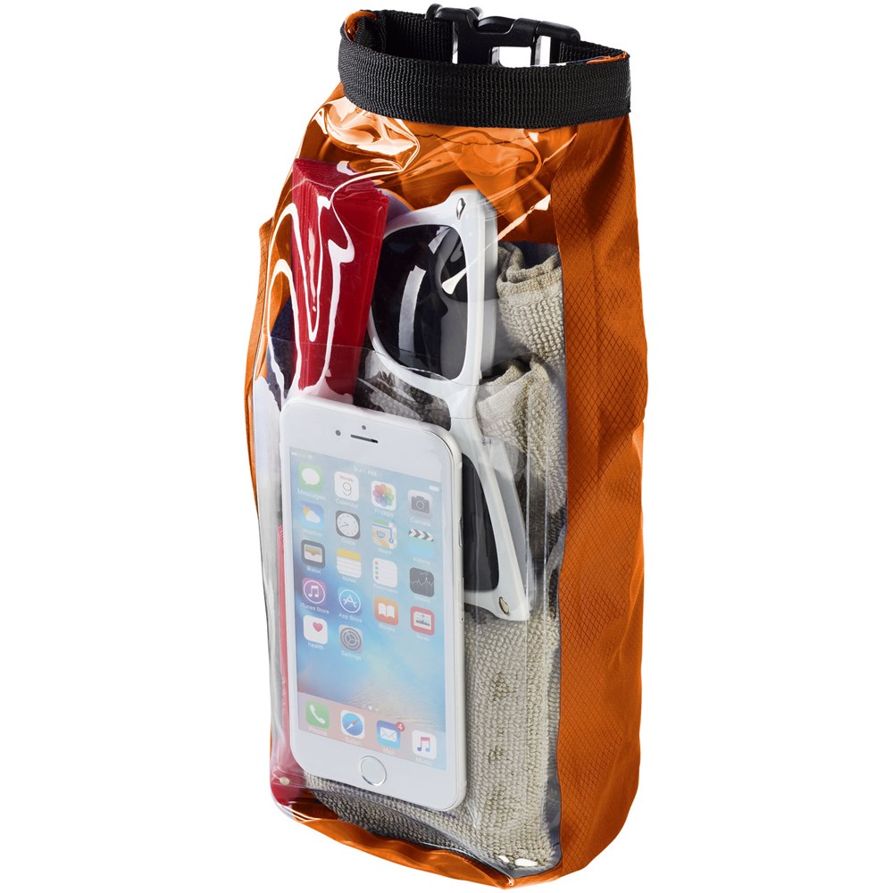 Een waterdichte tas die geweldig is voor buiten. De rolsluiting met plastic gesp zorgt ervoor dat waardevolle spullen droog en veilig worden bewaard. Kan gemakkelijk aan een tas of riem worden bevestigd. Inhoudcapaciteit 2 liter.