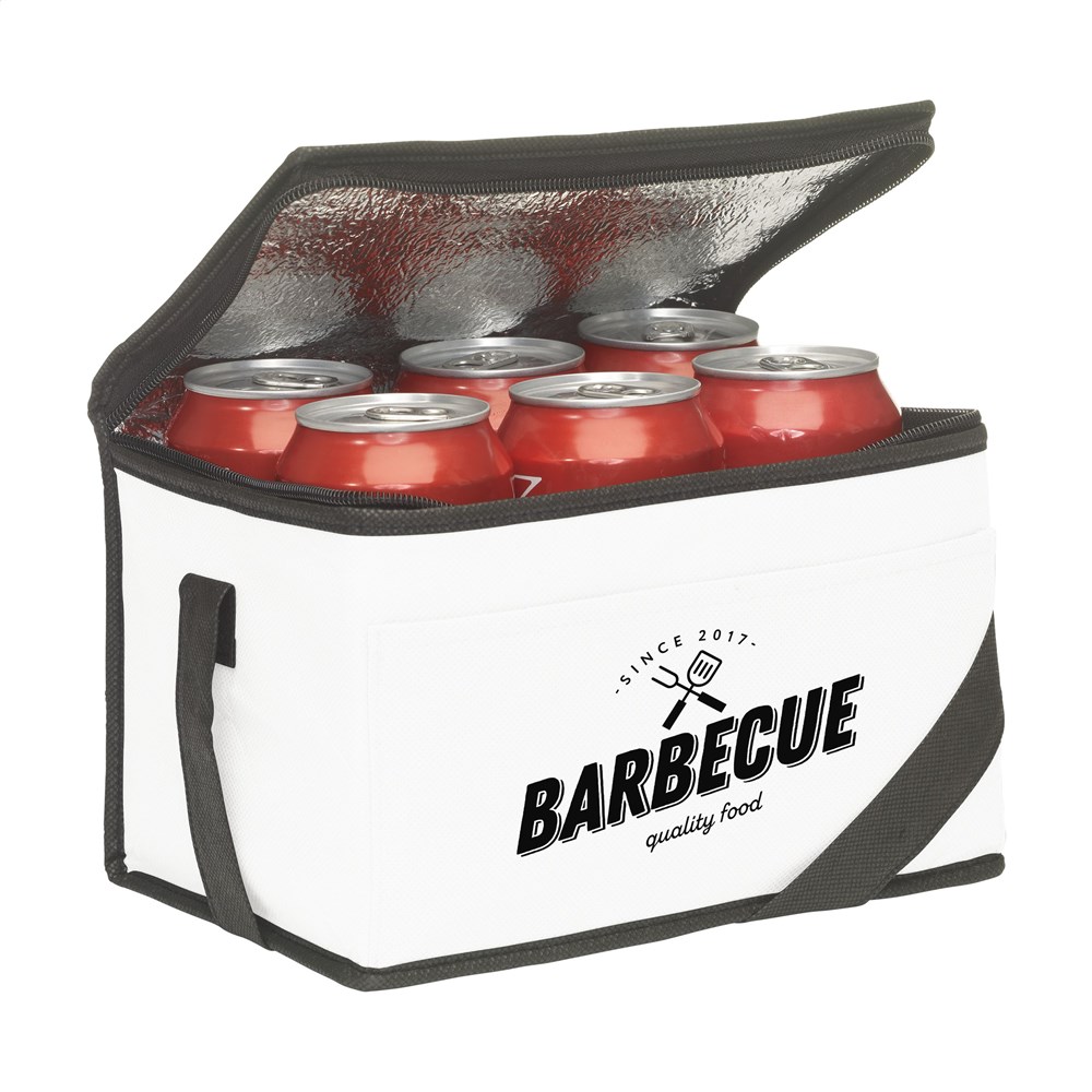 Koeltasje van nonwoven materiaal (80 g/m²) geschikt voor 6 blikjes drank of etenswaren. Met draagriem.