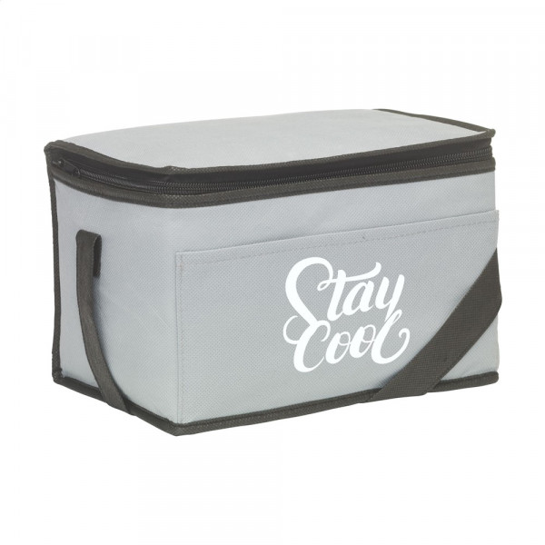 Koeltasje van nonwoven materiaal (80 g/m²) geschikt voor 6 blikjes drank of etenswaren. Met draagriem.