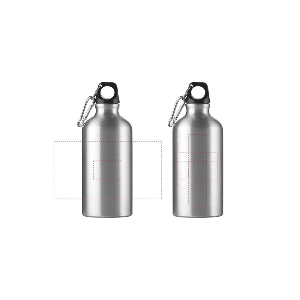 Enkelwandige, aluminium waterfles met hoogglans finish, kunststof schroefdop met sleutelring en metalen karabijnhaak. De karabijnhaak is niet geschikt als klimgereedschap. Lekvrij. Inhoud 500 ml.