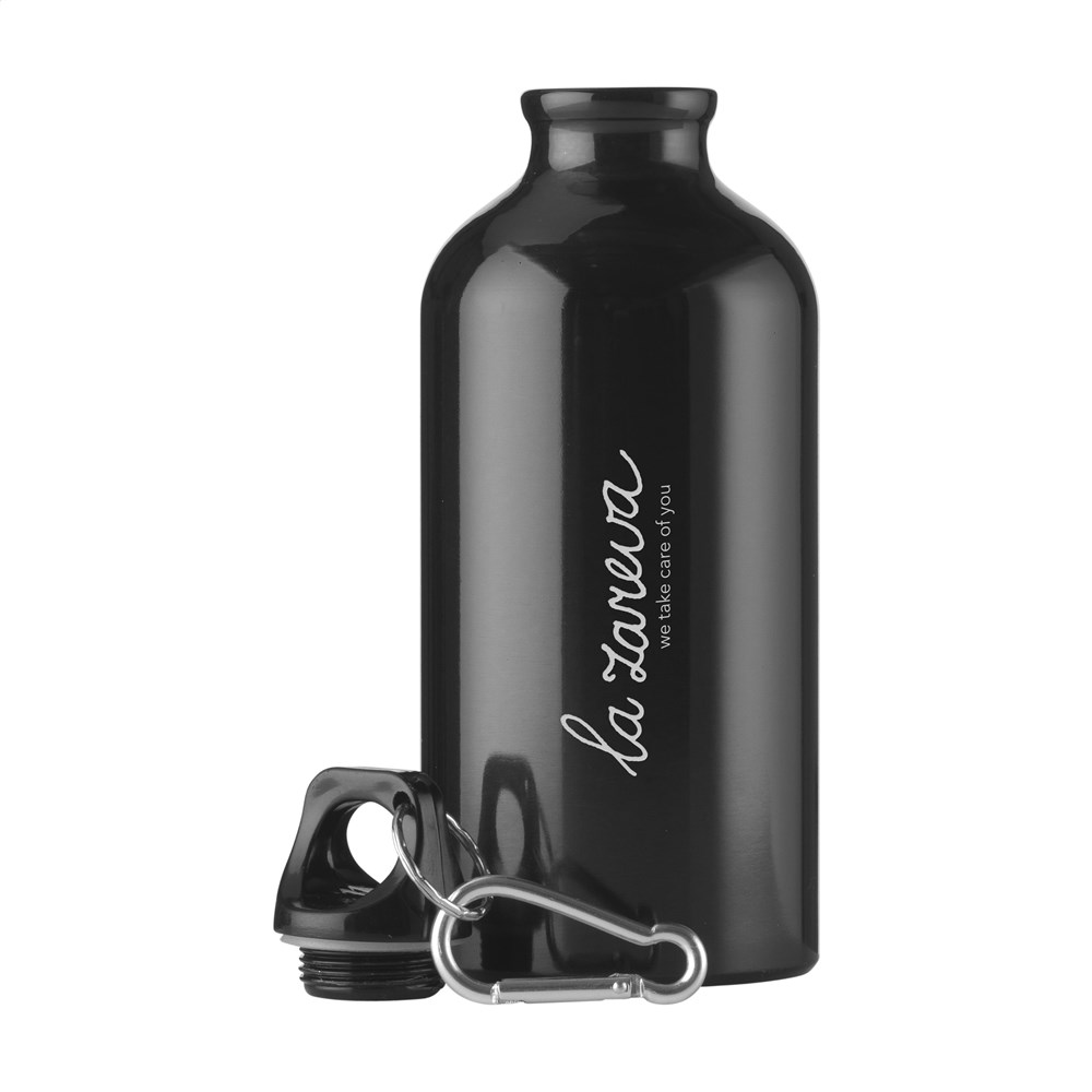 Enkelwandige, aluminium waterfles met hoogglans finish, kunststof schroefdop met sleutelring en metalen karabijnhaak. De karabijnhaak is niet geschikt als klimgereedschap. Lekvrij. Inhoud 500 ml.