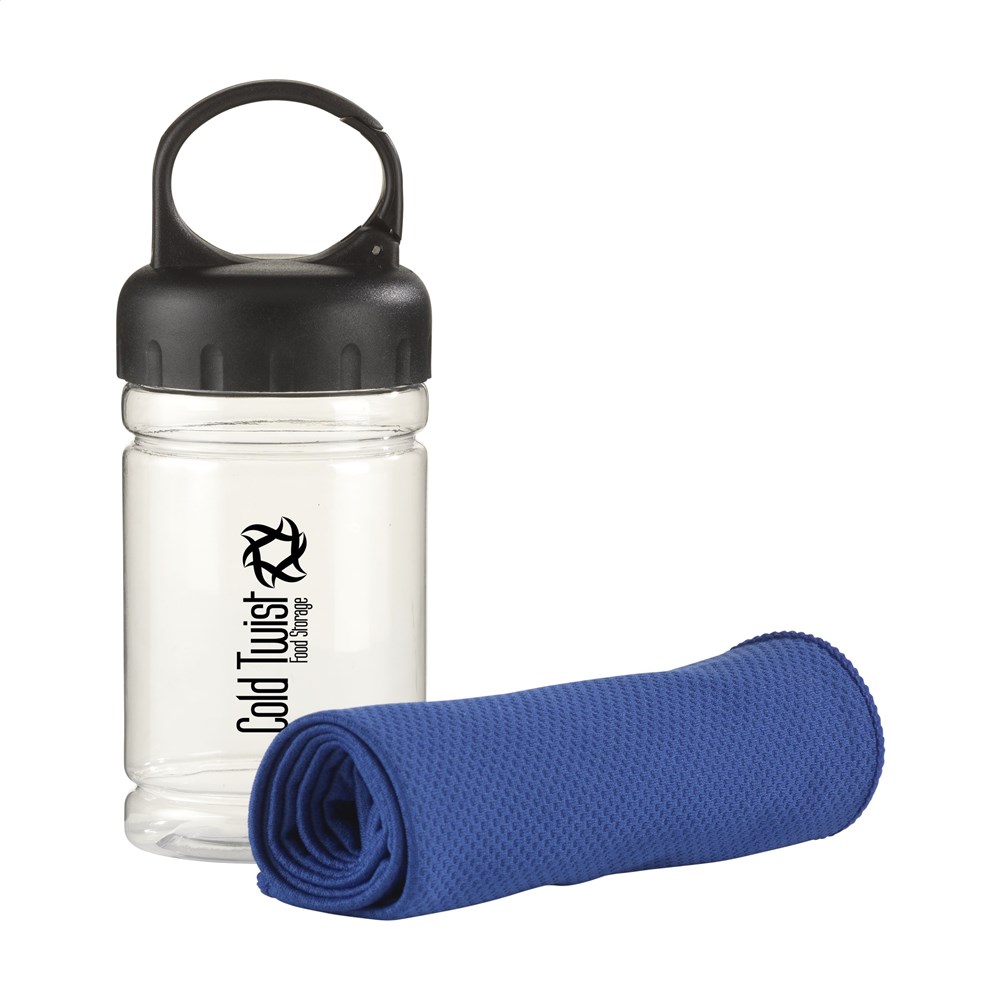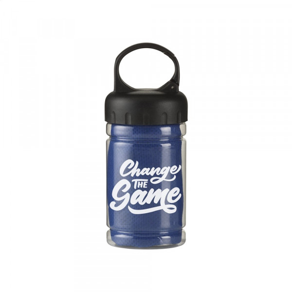 Speciale koelhanddoek van 100% polyester. Na een dompeling in koud water biedt deze handdoek verkoeling tijdens sportieve activiteiten of bij zonnebrand. Ideaal formaat (afm. 30 x 80 cm) om te dragen als nekkoeler. In transparante koker met ABS schroefdeksel met karabijnhaak.