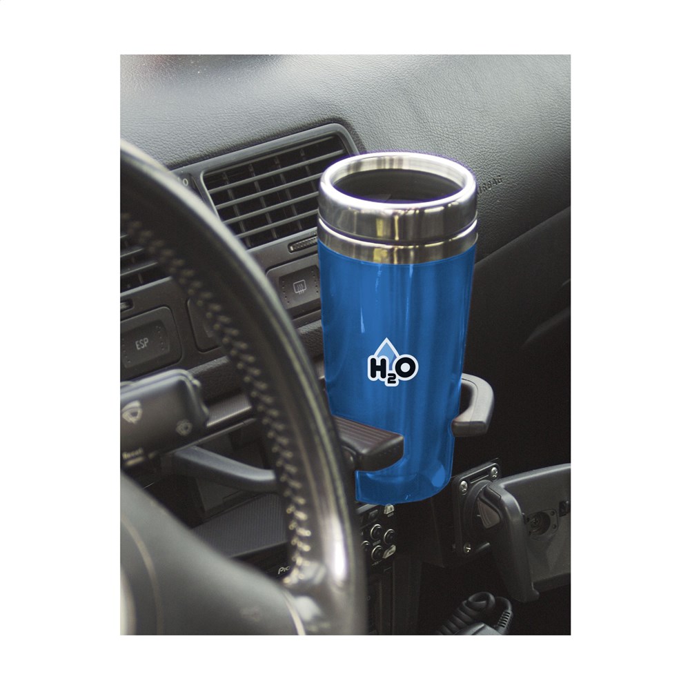 Dubbelwandige thermosbeker met RVS binnenzijde en kunststof buitenzijde, deksel met schuif-/klikopening en slipvaste onderzijde. Inhoud 500 ml. Per stuk in doos.