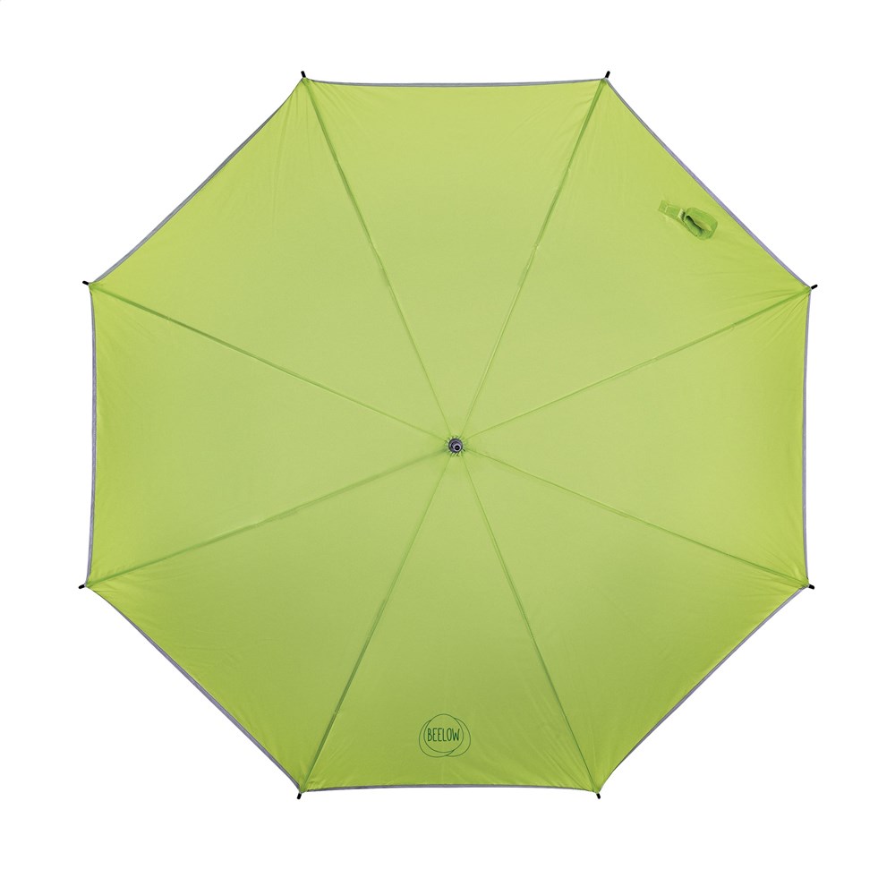Lichtgewicht stormparaplu met reflecterende bies, 190T nylon bespanning, glasvezel frame, metalen steel, soft handgreep en klittenbandsluiting.