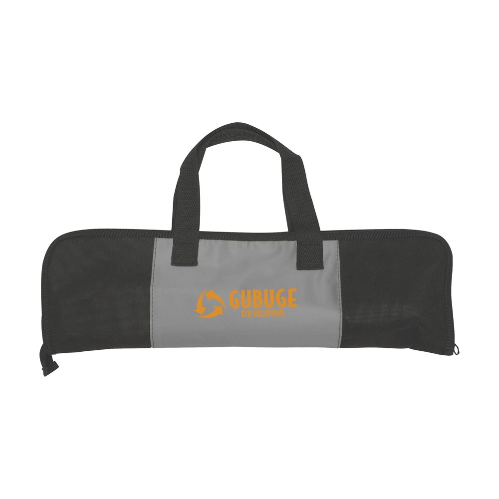 3-delige RVS barbecueset: spatel, vork en vleestang. In nonwoven etui met extra 420D nylon insteekvak op voorzijde. Conform EU-norm (2004/1935/CE).