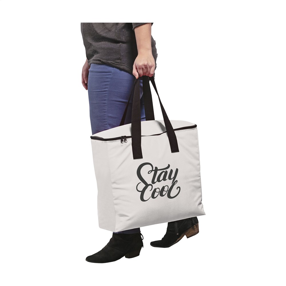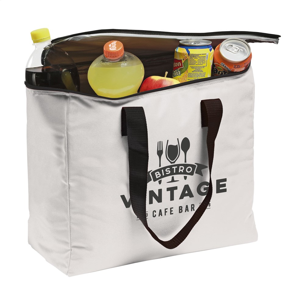 Grote, stevige, 600D polyester koeltas met ritssluiting en handgrepen. Enorm veel opbergruimte en geschikt voor flessen tot 2 liter. Op te bergen als compact pakket.