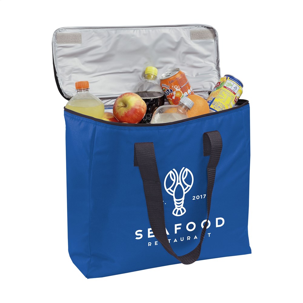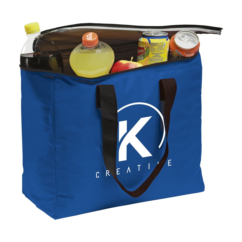 Grote, stevige, 600D polyester koeltas met ritssluiting en handgrepen. Enorm veel opbergruimte en geschikt voor flessen tot 2 liter. Op te bergen als compact pakket.