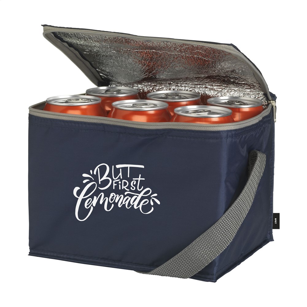 Koeltasje van 210D RPET polyester: gemaakt van gerecyclede PET-flessen. Geschikt voor 6 blikjes drank. Met draagriem.