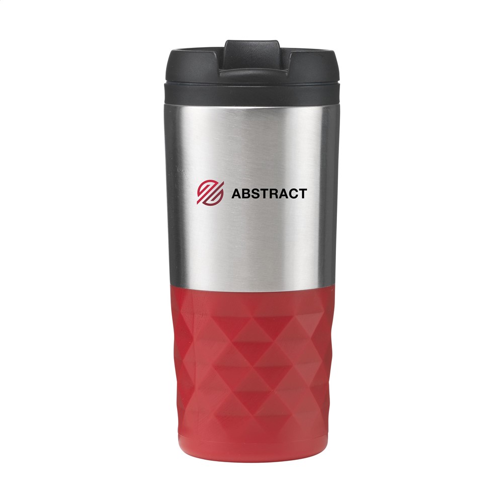 Dubbelwandige, lekvrije, RVS thermosbeker met schroefdeksel en klikopening -kan eenmaal geopend worden vastgeklikt-. Met opvallend grafisch 3D diamantpatroon in de gekleurde, kunststof grip. Slipvaste onderzijde. Inhoud 300 ml. Per stuk in doos.