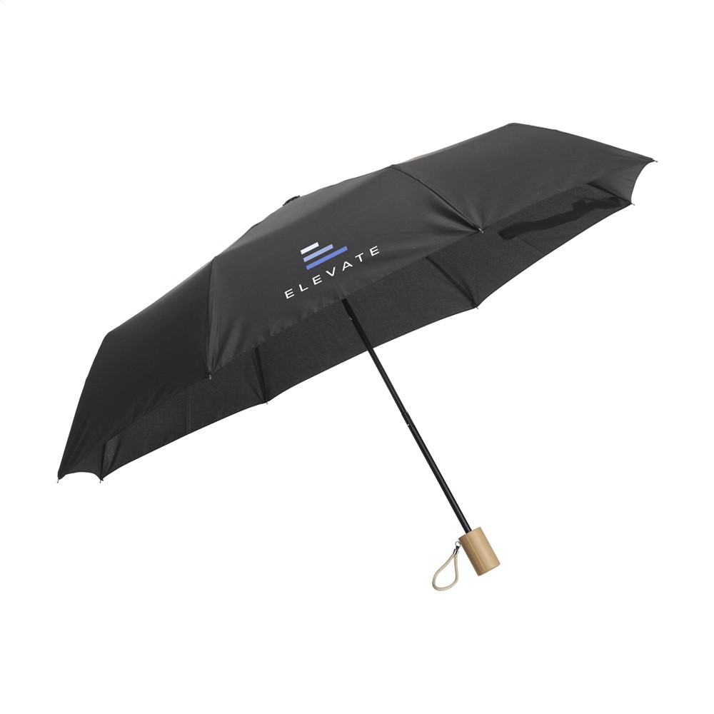 Opvouwbare paraplu van 190T RPET pongee polyester (gerecycled van PET-flessen). Met metalen frame en steel, mooie bamboe handgreep met katoenen lus, klittenbandsluiting, opberghoes en RPET label. Manuele bediening.