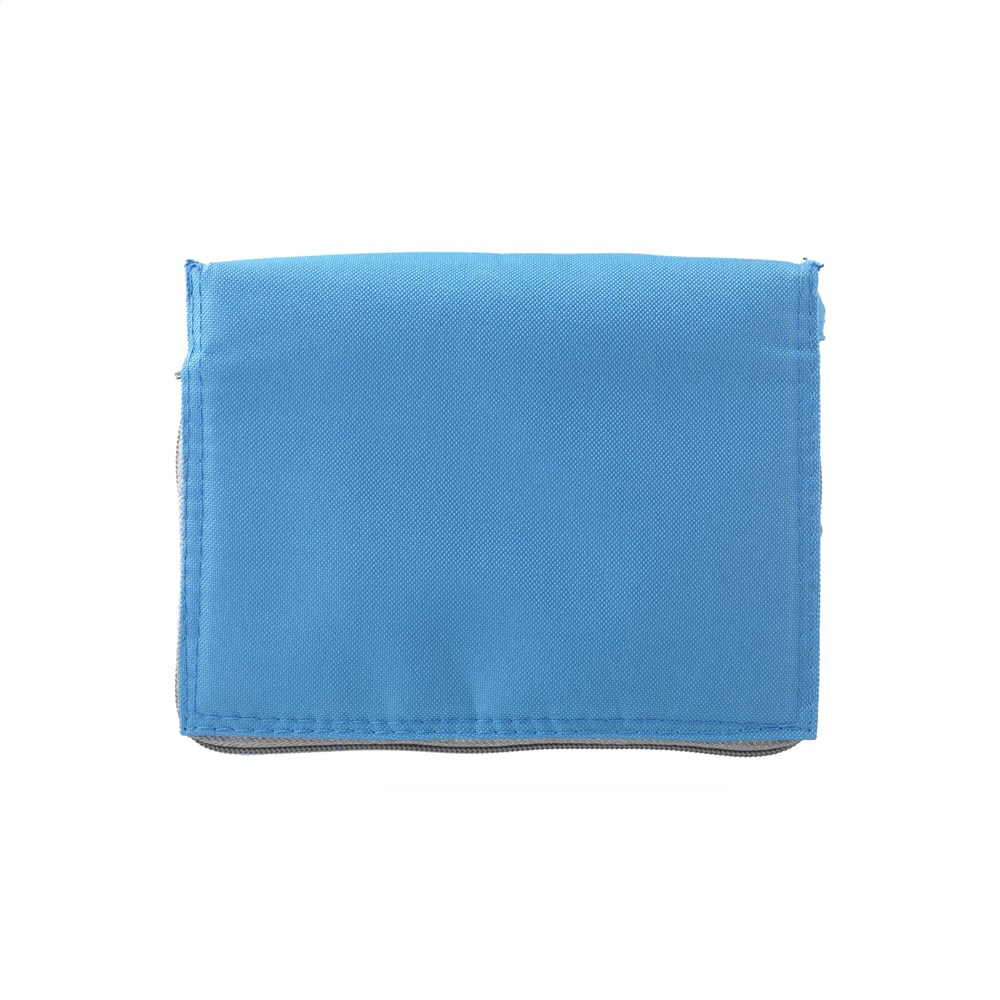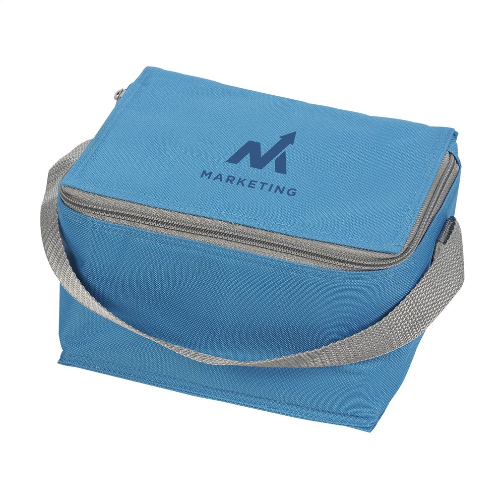 600D polyester koeltasje, geschikt voor 6 blikjes drank. Met draagriem.