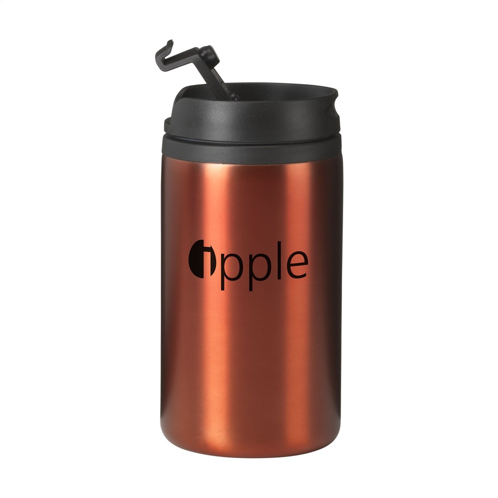 Dubbelwandige thermosbeker met RVS buitenwand en kunststof binnenwand, schroefdeksel met klikopening en slipvaste onderzijde. Lekvrij. Inhoud 300 ml. Per stuk in doos.