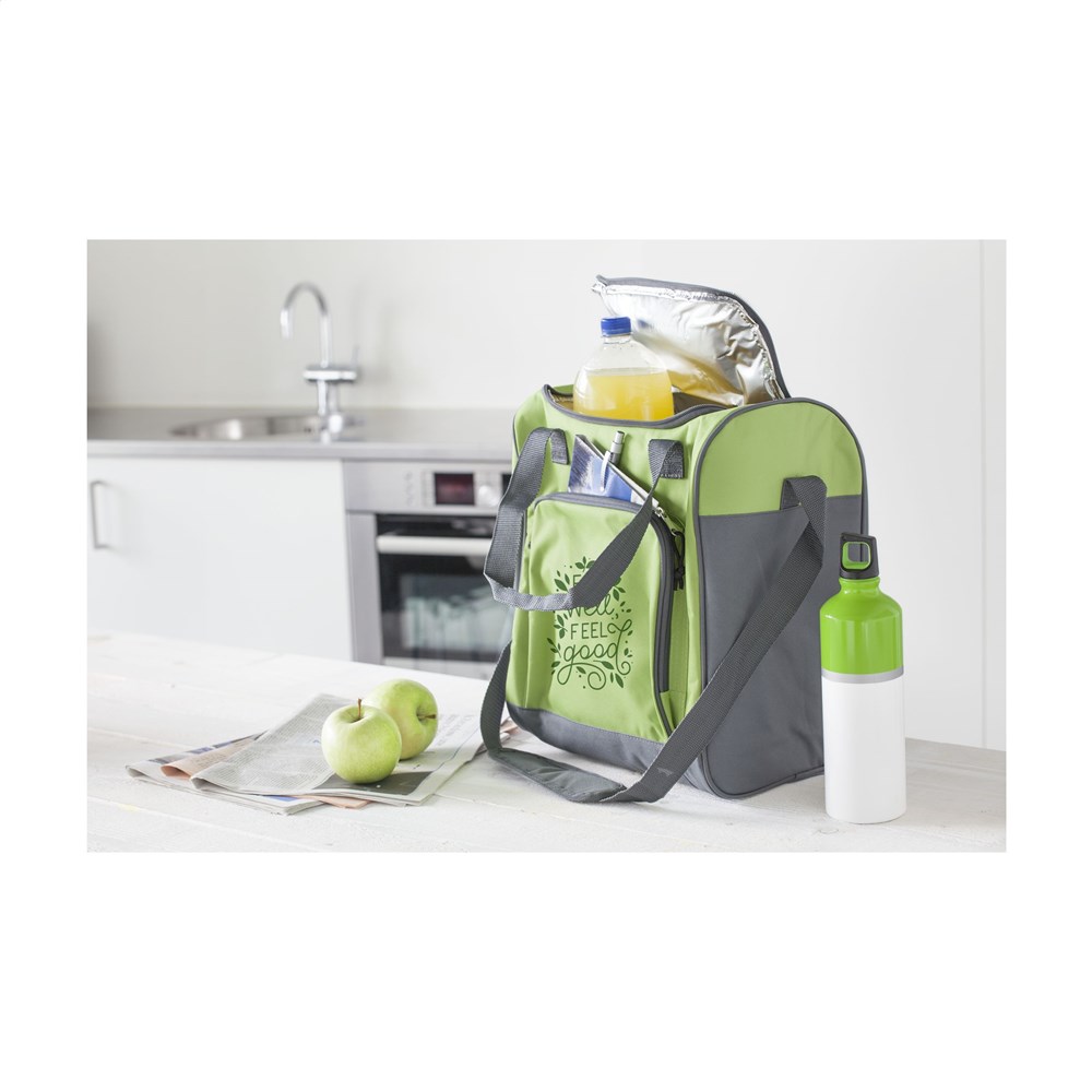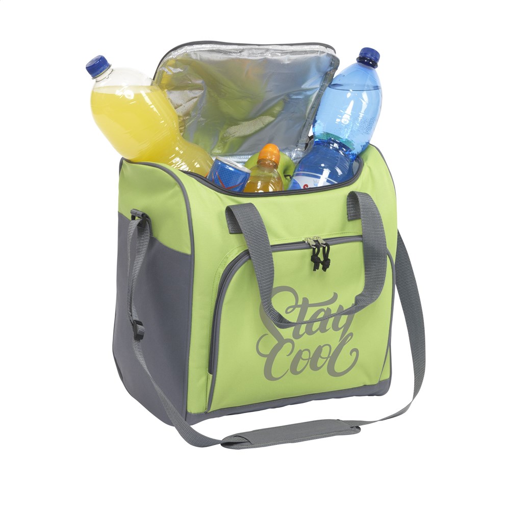 Stevige koeltas van 600D polyester. Met zeer ruim koelvak en ritsvak, verstelbare schouderriem met gewatteerd schouderstuk en 2 handgrepen. Verrassend veel opbergruimte: geschikt voor 6 flessen tot 2 liter.
