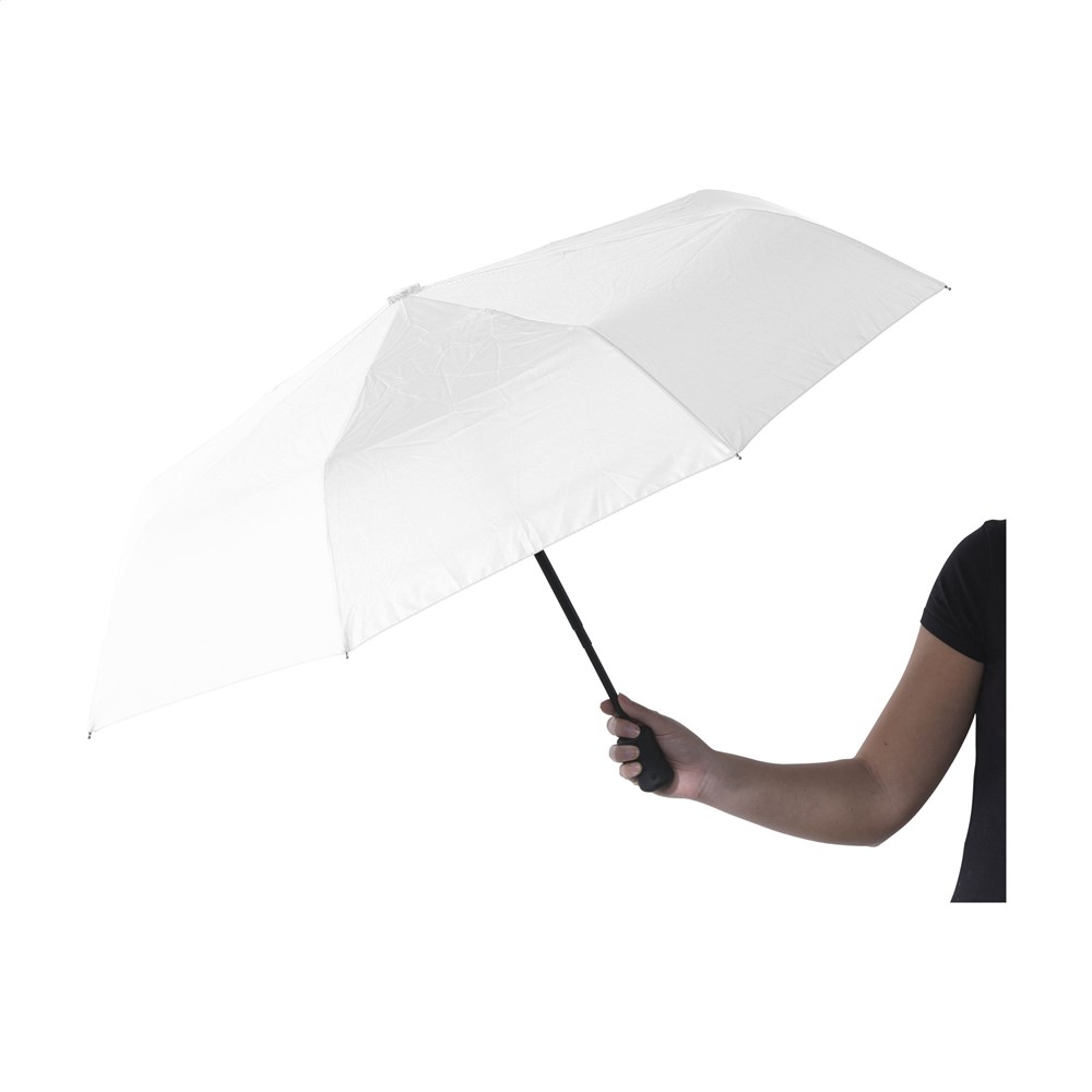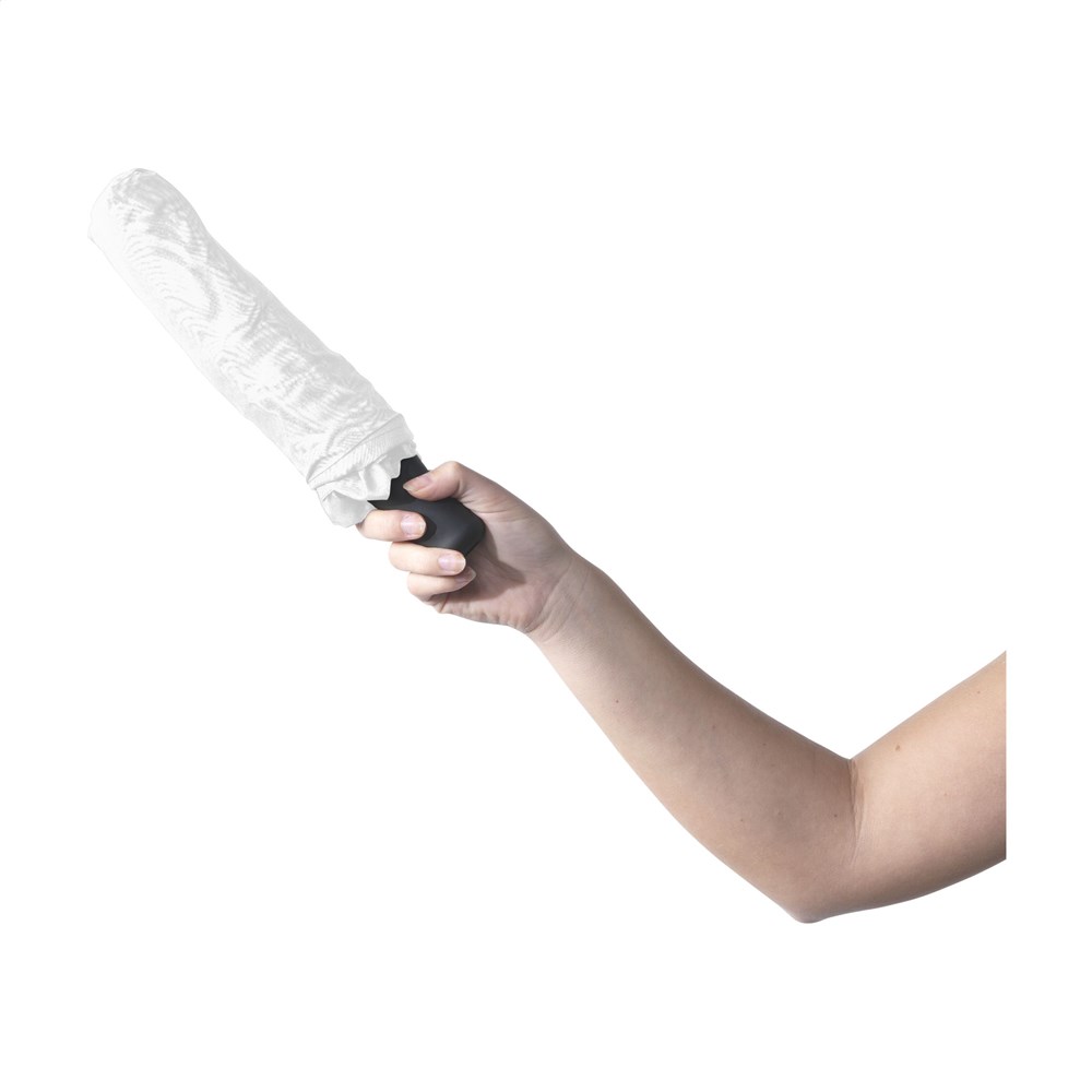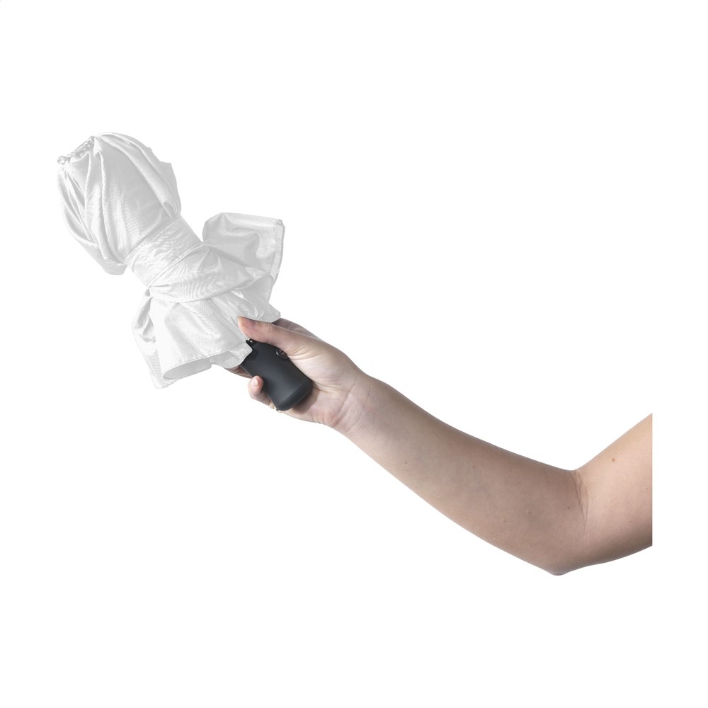 Volautomatische in- en uitklapbare paraplu met 190T pongee nylon bespanning, metalen steel en frame, rubberen handgreep met polslus, klittenbandsluiting en opberghoes. Lengte ingevouwen: 28 cm.