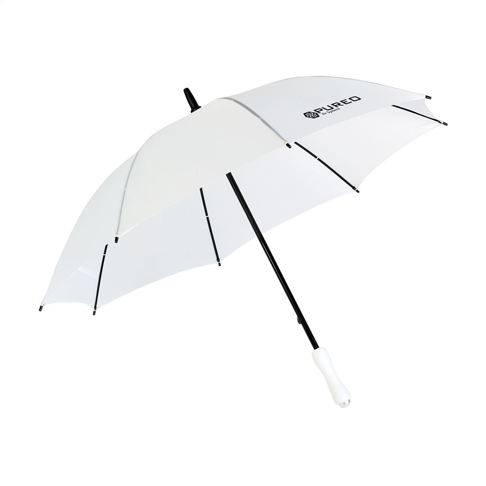 Paraplu met 190T nylon bespanning, metalen frame en steel, voorgevormde foam handgreep en klittenbandsluiting. In handige opberghoes met schouderriem.