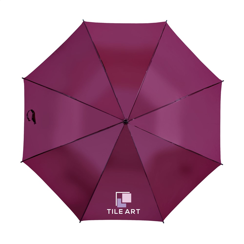 Paraplu met automatische telescoopvering. 190T polyester bespanning, glasvezel frame, metalen steel, soft foam handgreep en klittenbandsluiting.