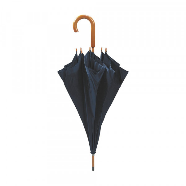 Paraplu met 190T nylon bespanning, metalen frame, houten steel en handgreep en klittenbandsluiting.