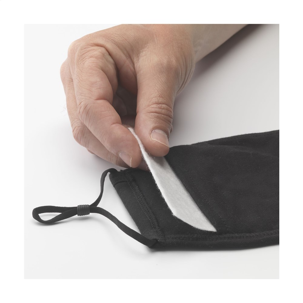 Comfortabel, zacht en ademend, 2-laags mondmasker van 100% katoen (2 x 190 g/m²). Met extra inzetstuk aan de achterzijde voor filter (niet bijgeleverd). Geschikt voor jong en oud door de verstelbare oorlussen en ideale pasvorm. Dit item is niet geschikt voor medisch gebruik en niet bedoeld als persoonlijk beschermingsmiddel (zoals vermeld in EU-richtlijn 2016/425). Dit mondkapje is ontworpen voor persoonlijk gebruik en om het overbrengen van vloeistoffen op anderen te minimaliseren. Machine wasbaar. Handwas aanbevolen i.v.m. behoud van de opdruk.