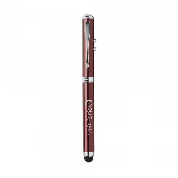 Blauwschrijvende, aluminium balpen met rubberen top/pointer voor het bedienen van touchscreens (zoals iPhone/iPad), geïntegreerde laserpointer, felwit LED-lampje en metalen clip. Incl. celbatterijen. Geef uw geschenk meer karakter met één van onze stijlvolle geschenkverpakkingen.