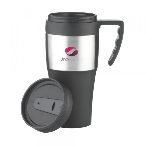 Dubbelwandige, kunststof/RVS thermosbeker met schroefdeksel en schuif-/klikopening. Inhoud 400 ml. Per stuk in doos.
